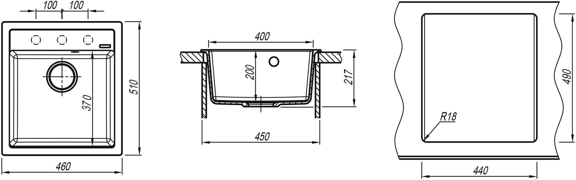 Размер мойки 46 x 51 см
