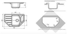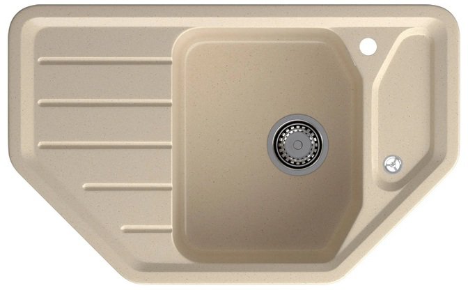 Мойка из искусственного камня, врезная, угловая. Практичная и функциональная модель, имеет удобное крыло и небольшое дополнительное крыло со сливным отверстием.