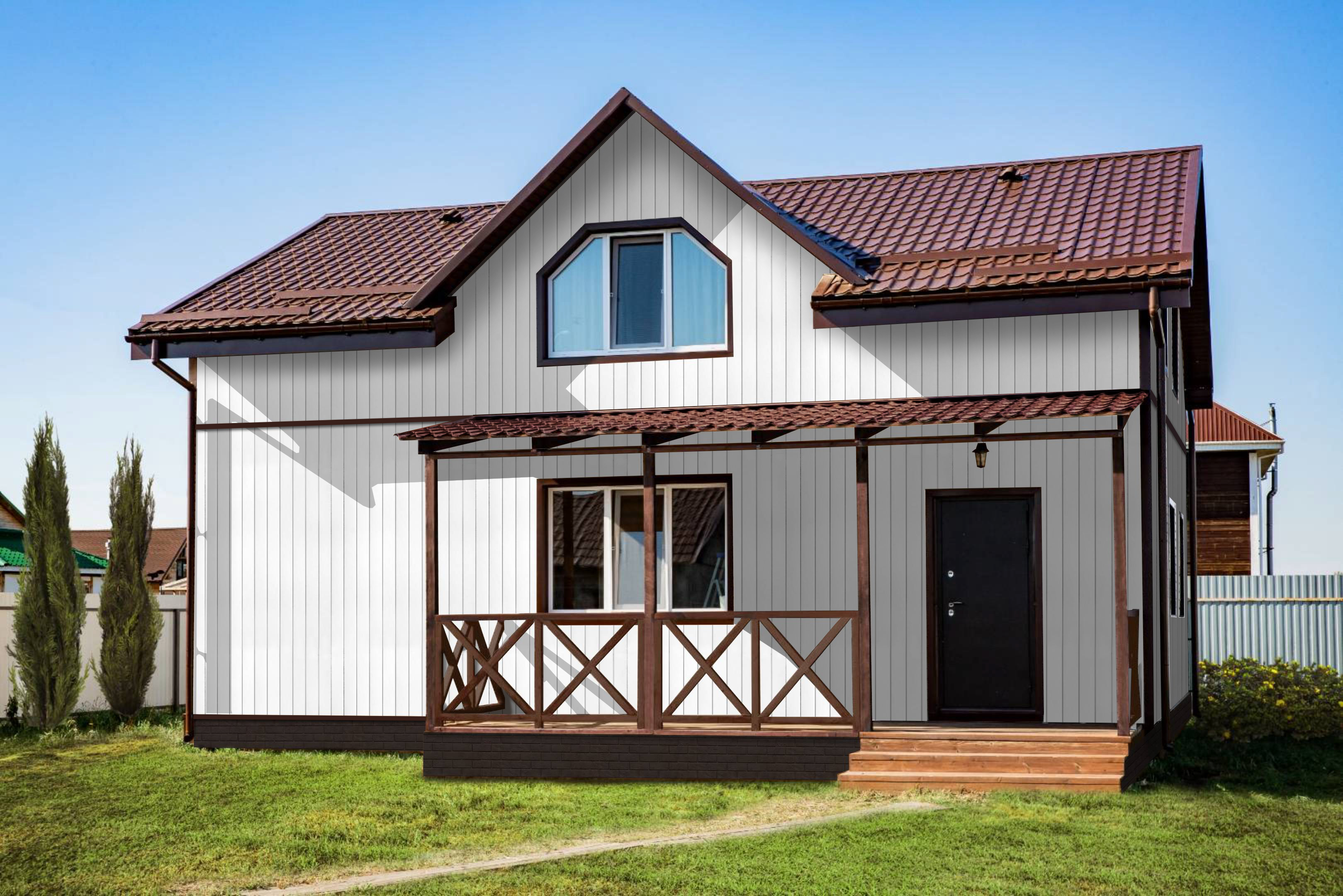 в отличие от облицовки фасада деревом, металлический сайдинг Вертикаль прост в монтаже и не требует дополнительного послемонтажного ухода