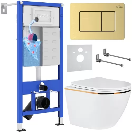 Комплект инсталляция Roxen StounFix Dual Fresh 6 в 1 968460 с унитазом Antares Antares Gold 530110-01G и клавишей смыва Steel 420280GB брашированное золото