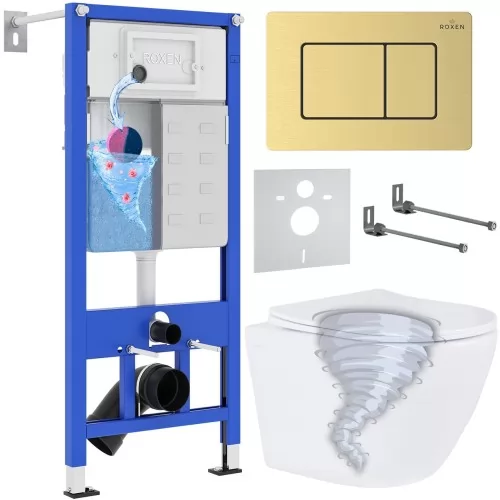 Комплект инсталляция Roxen StounFix Dual Fresh 6 в 1 968463 с унитазом Antares Tornado 530205-01 и клавишей смыва Steel 420280GB брашированное золото