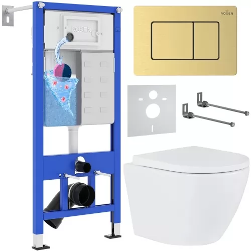 Комплект инсталляция Roxen StounFix Dual Fresh 6 в 1 968454 с унитазом Antares 530185-02 и клавишей смыва Steel 420280GB брашированное золото