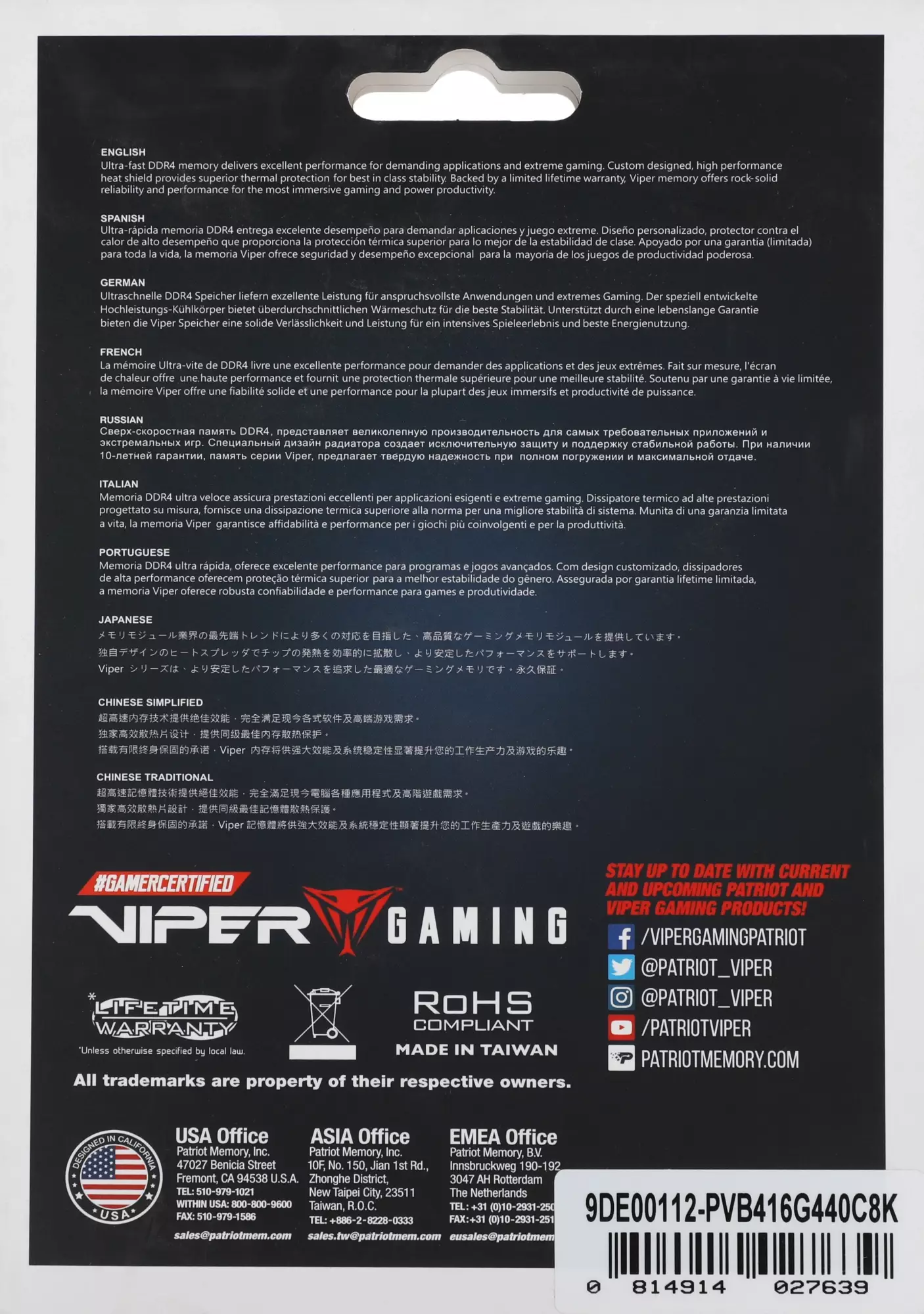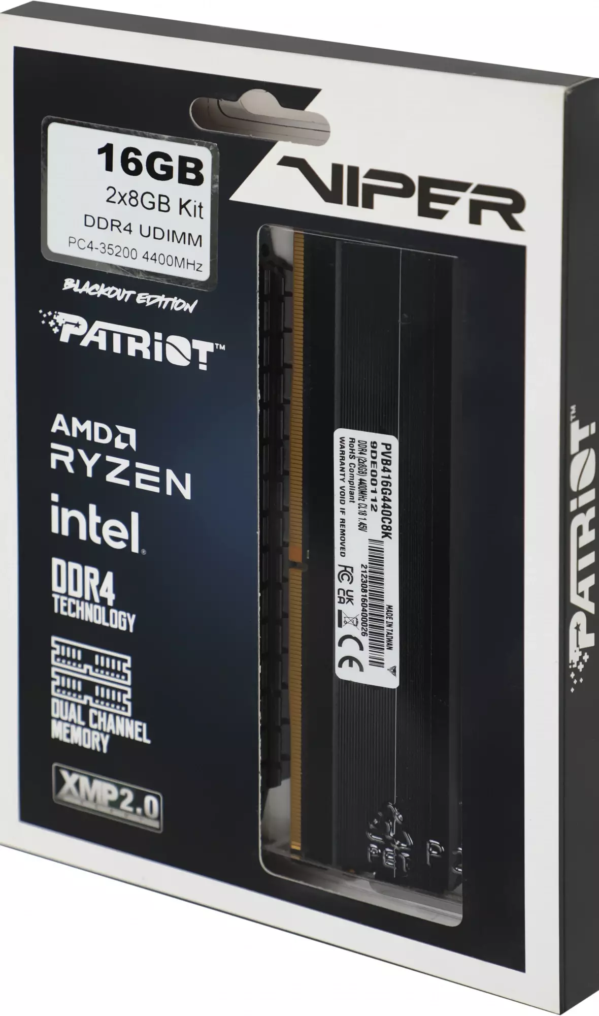 Оперативная память Patriot Viper 4 Blackout DDR4 - 2x 8GB, 4400 МГц, DIMM, CL18, RTL (pvb416g440c8k)