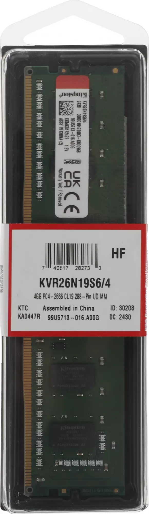 Оперативная память Kingston VALUERAM DDR4 - 4Gb, 2666 МГц, DIMM, CL19 (kvr26n19s6/4)