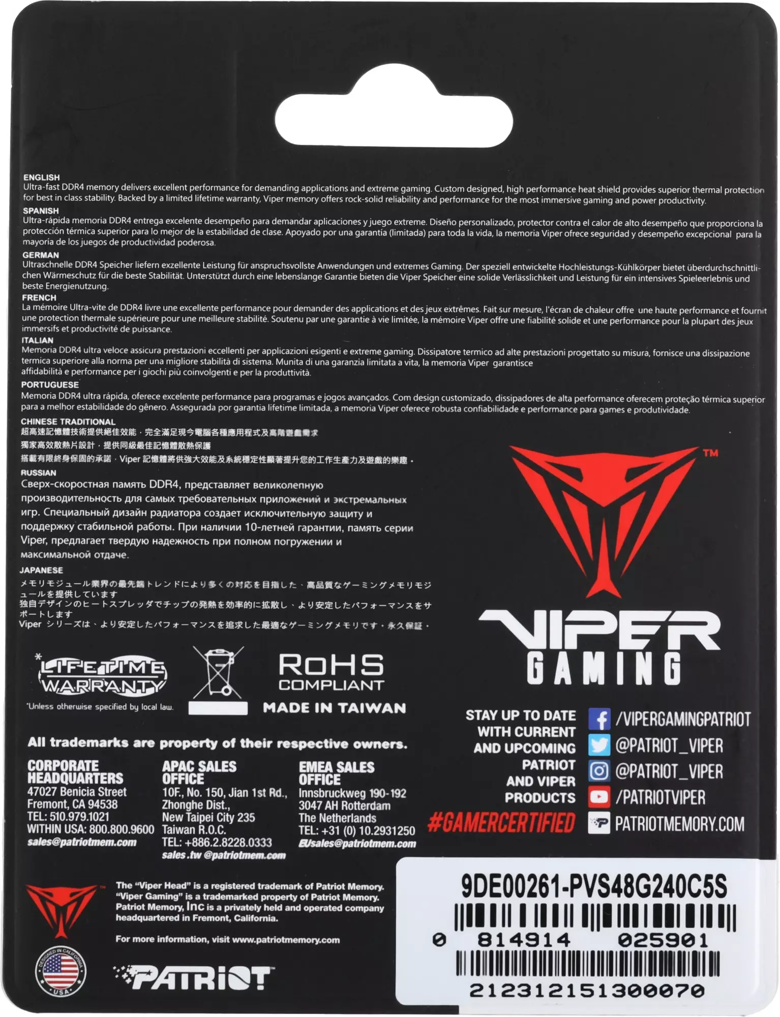 Оперативная память Patriot Viper Steel DDR4 - 8Gb, 2400 МГц, SO-DIMM, CL15 (pvs48g240c5s)