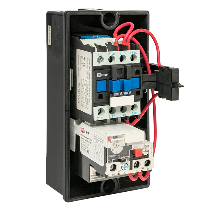 Пускатель магнитный КМЭ EKF PROxima является комплектным устройством, состоящим из малогабаритного контактора КМЭ, теплового реле РТЭ, оболочки с сальниками и кнопок управления. Пускатели предназначены для дистанционного пуска непосредственным подключением к сети и остановки трехфазных асинхронных электродвигателей с короткозамкнутым ротором на напряжение переменного тока до 400 В, а также для защиты электродвигателей от перегрузок недопустимой продолжительности и сверхтоков, возникающих при обрыве одной из фаз. При применении контакторов КМЭ 0910 – КМЭ 3210 используется пластиковый корпус, контакторов КМЭ 4011 – КМЭ 9511 – металлическая оболочка.