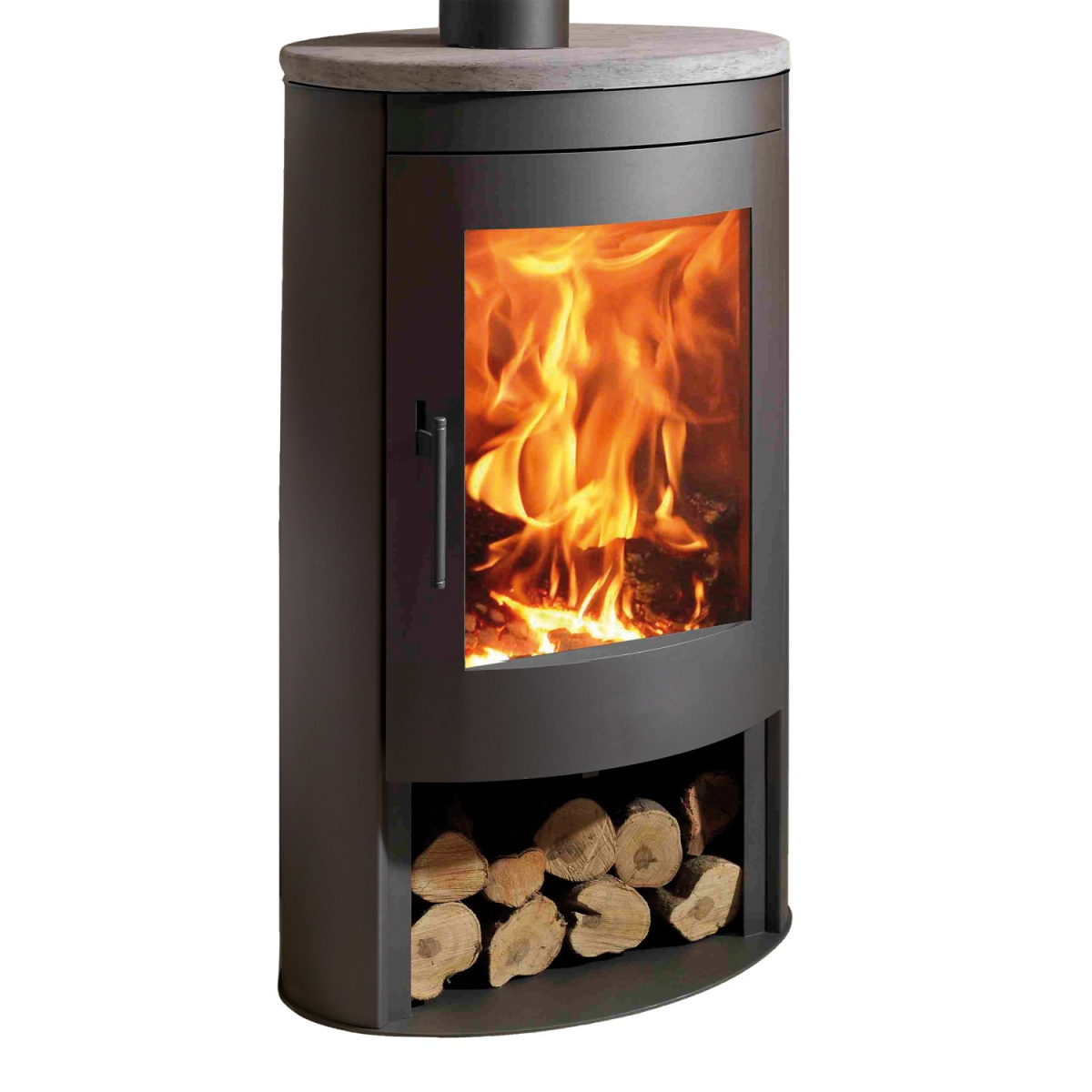 Печь-камин Panadero Oval Ecodesign помимо стильного современного дизайна отличается технологичностью. Печь позволяет с относительно небольшой закладки дров получить большой красивый огонь. И напротив, если необходимо прогреть помещение, печь способна отопить комнату объемом до 270 м3 . Отзывчивость на регулировки и способность хорошо гореть при минимальной подаче воздуха достигается за счет футеровки топочной камеры вермикулитом , а также правильно спроектированной подачи воздуха. Воздух в печь попадает через отверстие, расположенное в нижней части корпуса. Далее воздух проходит внутри канала по задней стенке печи и частично попадает в топочную камеру через отверстия вторичного дожига . Далее воздух проходит внутри канала, расположенного в верхней части печи, где максимально прогревается, и только потом сильно разогретый воздух попадает на стекло. Благодаря такому сложному каналу подачи воздуха топочная камера очень хорошо прогревается и сажа не оседает на стекле, происходит более полное сжигание топлива. Именно поэтому нет необходимости делать огромные закладки дров для прогрева топочной камеры.