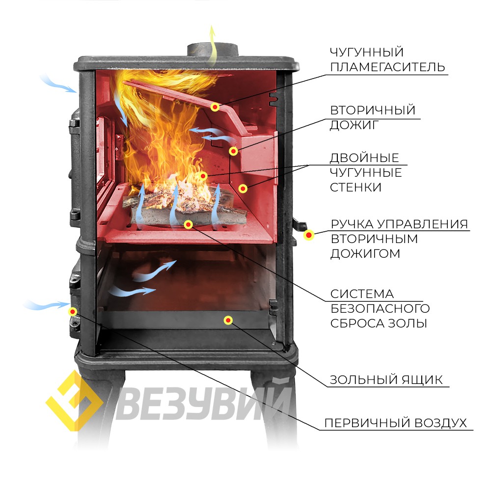 Топка печи-камина усилена чугунными вставками с системой вторичного дожига. С помощью этой функции по каналам подачи вторичного воздуха поступает кислород, который нагревается при прохождении между топочной камерой и стенками корпуса. Далее нагретый воздух через дефлектор поступает в топку, перемешивается с газами - продуктами горения, чем вызывает повторное возгорание. Регулировка этой системы осуществляется рычагом, расположенным справа на тыльной стороне печи-камина. Над дверцей печи-камина расположена система чистое стекло, которая помогает оставаться стеклу чистым. В нижней части печи на дверце зольного ящика расположена ручка для регулировки подачи воздуха в колосниковую зону, которая помогает контролировать интенсивность горения. В нижней части топки предусмотрена колосниковая решётка, которую можно привести в движение с помощью ручки, которая выведена справа на корпус печи. За счет этой функции появилась возможность безопасно сбрасывать золу в зольный ящик. Патрубок дымохода Ø 120мм со встроенной шиберной заслонкой – универсальный, со сменным положением. Он может быть установлен сверху или сзади в зависимости от размещения печи в помещении.