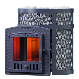 Печь «Искандер 25П2» с сеткой для камней и панорамным стеклом для парных объемом до 25 м. куб. - новый концепт чугунной теплонакопительной банной печи с прямым нагревом заряда.