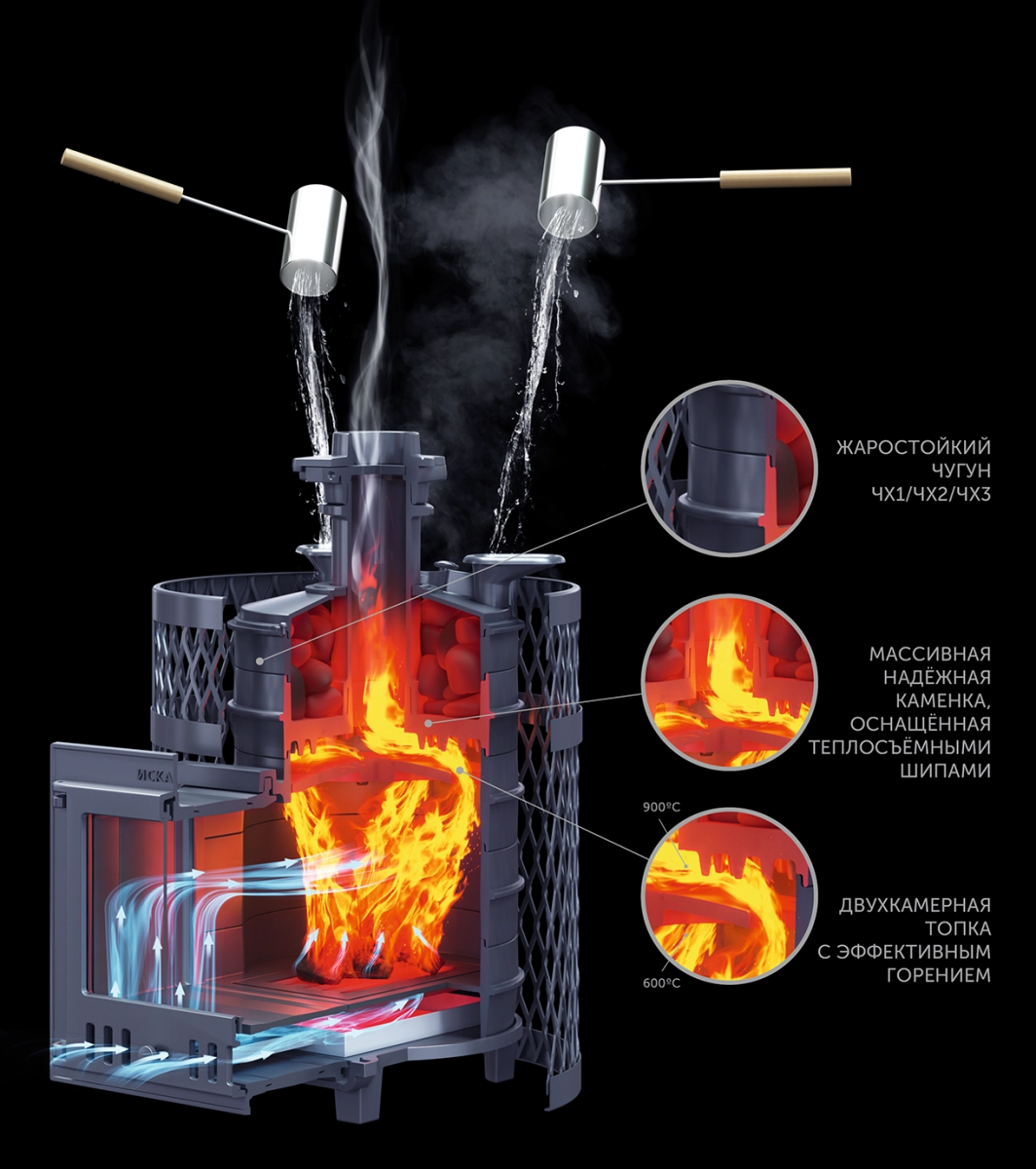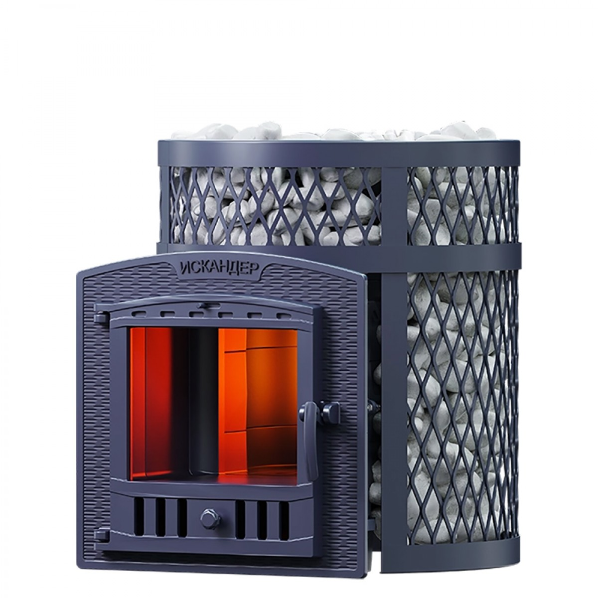 Печь «Искандер 18 П2» с сеткой для камней и панорамным стеклом для парных объемом до 18 м. куб. - новый концепт чугунной теплонакопительной банной печи с прямым нагревом заряда.