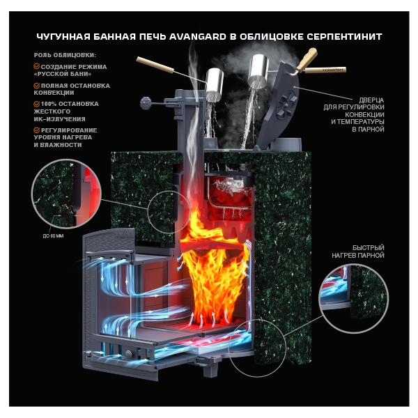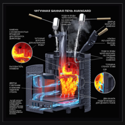 AVANGARD ЗК 40 (П2) - новый концепт чугунной теплонакопительной банной печи с прямым нагревом заряда. Корпус модульный, сборка происходит снизу вверх, модули соединяются по пазогребневой системе. Масса пароиспарителя в печи 62 кг, и он нагревается прямым контактом с пламенем. У пароиспарителя 2 поверхности с увеличенной рабочей площадью – снизу идёт нагрев огнём, а сверху поддаётся вода для пара. У печи уникальная, массивная каменка с теплонакопительными воронками, для получения легкого пара.