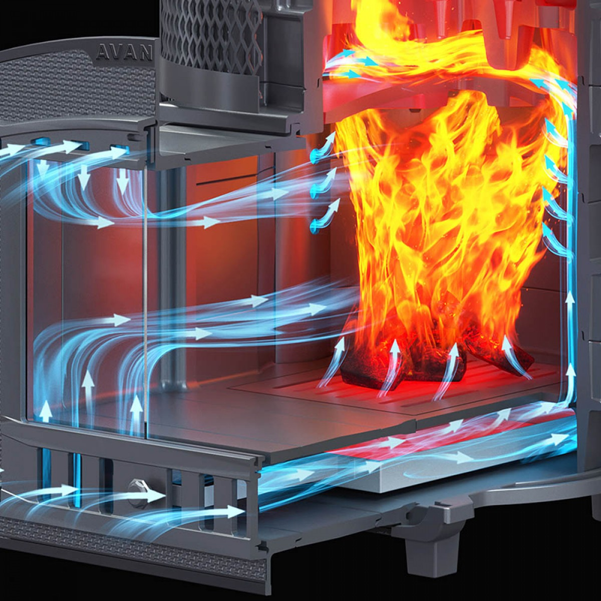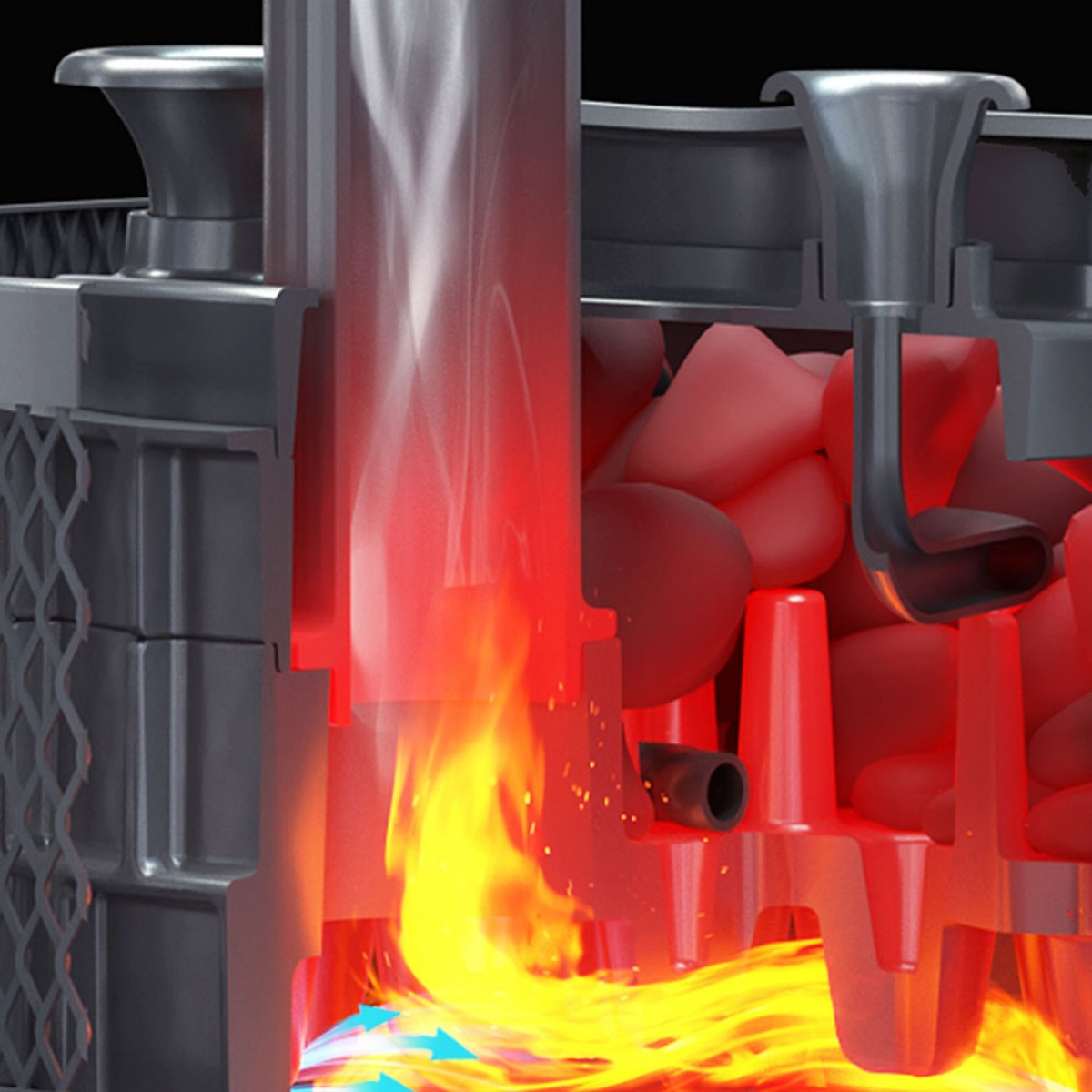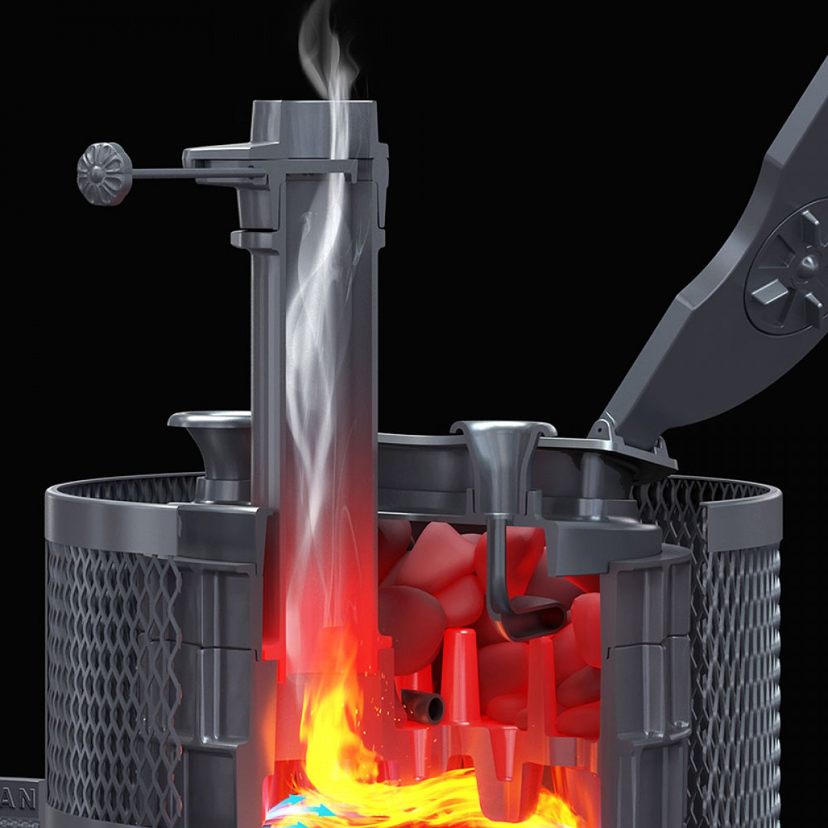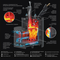 Под каменкой на 3-х упорах установлен рассекатель пламени, он разделяет пламя на 3 потока и направляет сначала на боковые части корпуса для интенсивного нагрева стенок и конвекционного нагрева воздуха в парной. Для этого на наружных поверхностях расположены конвекционные рёбра. Дальше пламя проходит через выступы к выходу в дымоход, нагревая каменку. Каменка позволяет устанавливать различные стартовые модули вместе с шиберным блоком.
