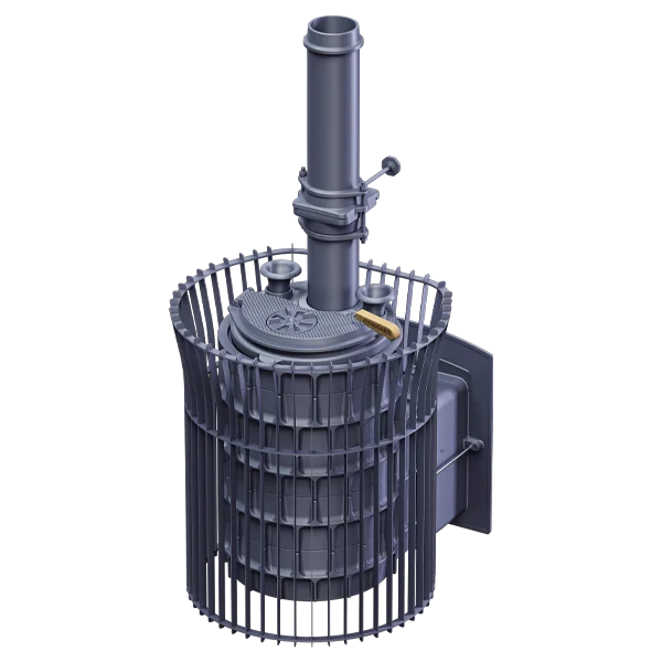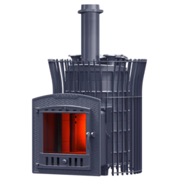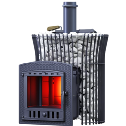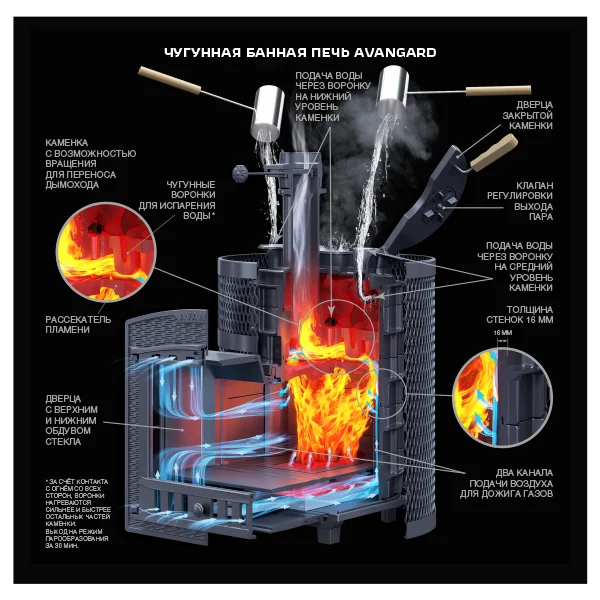 Масса пароиспарителя в печи AVANGARD 35 – 56 кг, и он нагревается прямым контактом с пламенем. У пароиспарителя 2 поверхности с увеличенной рабочей площадью – снизу идёт нагрев огнём, а сверху поддаётся вода для пара. У печи уникальная, массивная каменка с теплонакопительными воронками, для получения легкого пара.