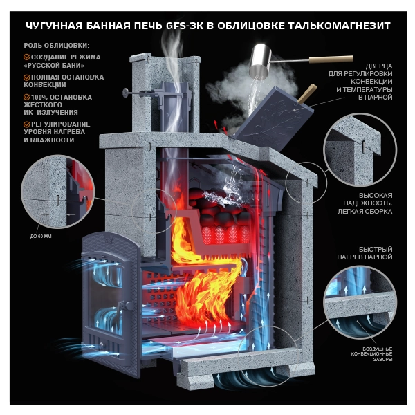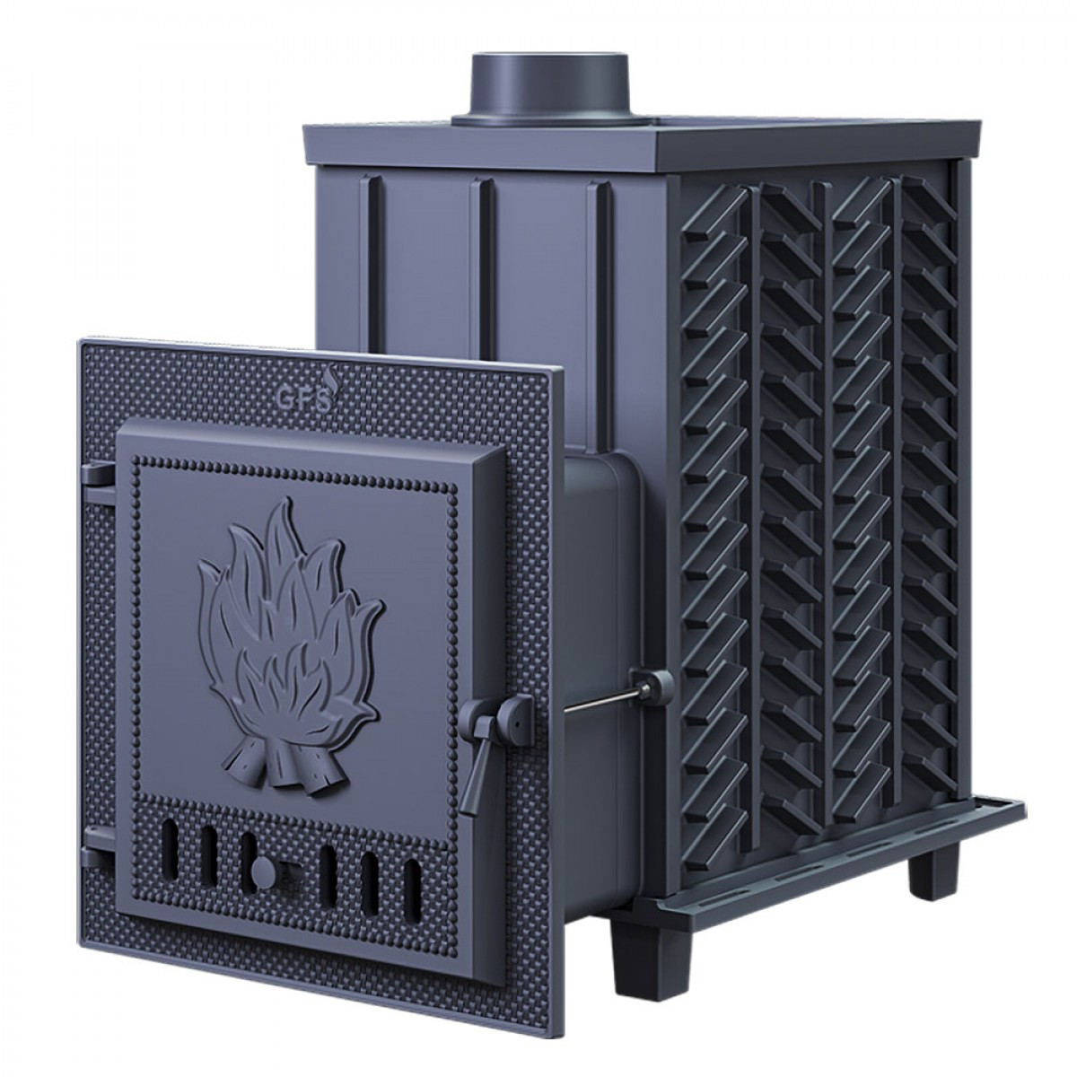 Печь для бани GFS ЗК - модель повышенной мощности и надежности для коммерческого применения. Основной принцип работы печи – получение пара с теплоёмкой каменки прямого нагрева. Каменка является сводом топки, нагревается с нижней поверхности снабженной теплосъемными шипами для увеличения контакта с пламенем. Увеличенная масса, толщина боковых стенок 14 мм повышают надежность и теплоаккумулирующую способность, а для быстрого нагрева парной боковые стенки оборудованы конвекционными ребрами не только снаружи, но и на внутренней поверхности.