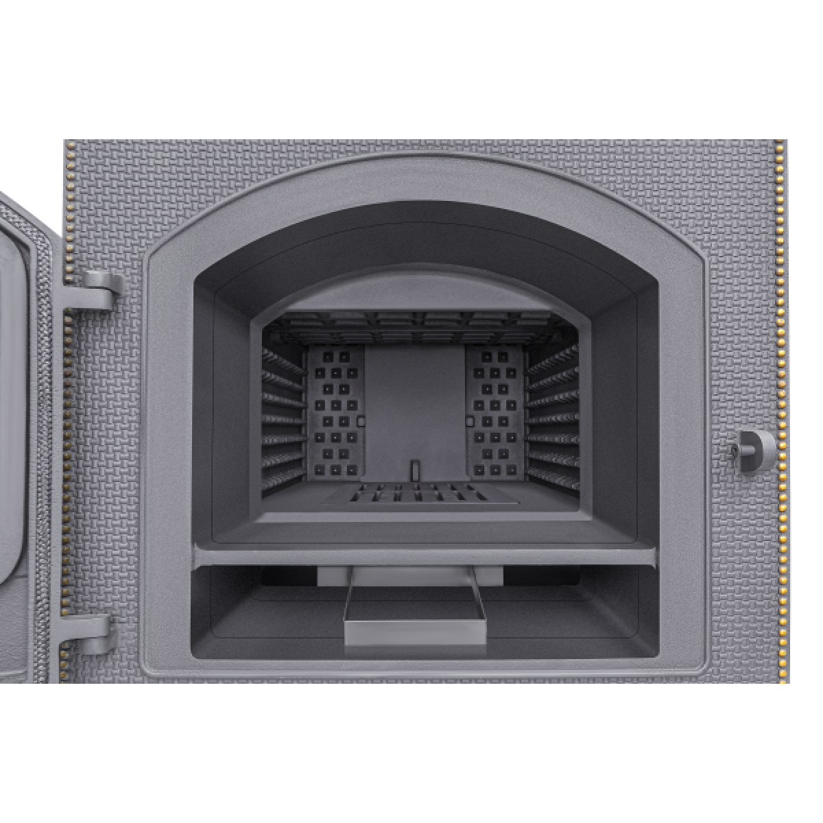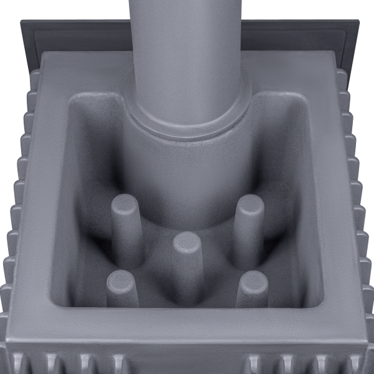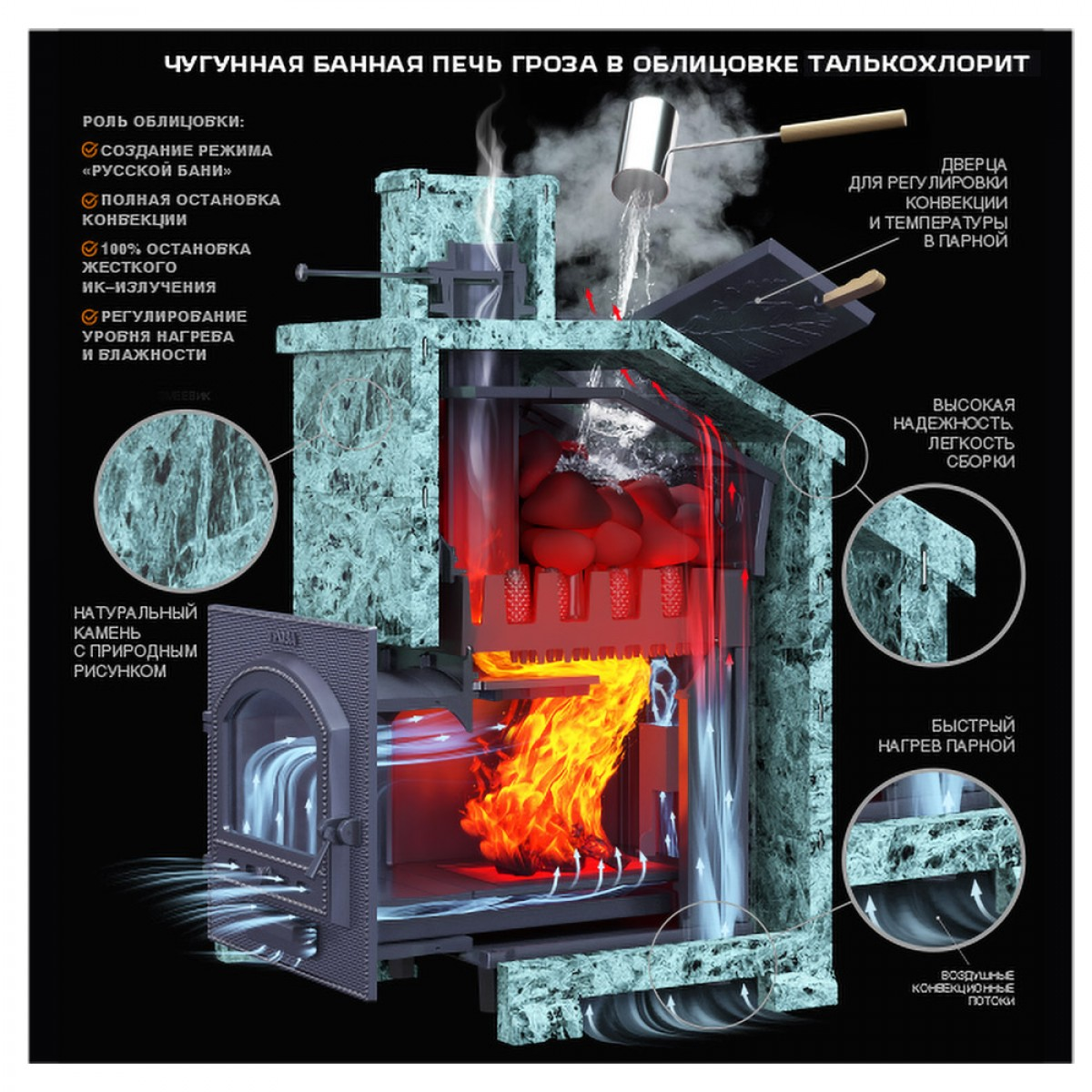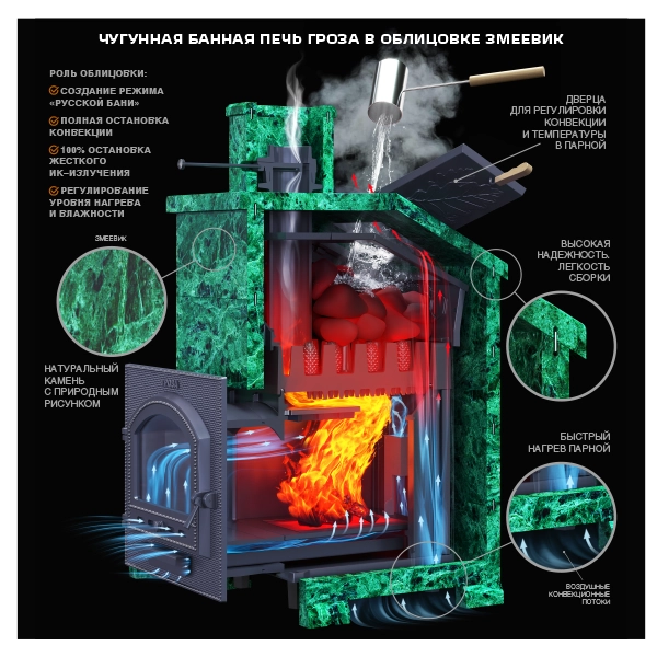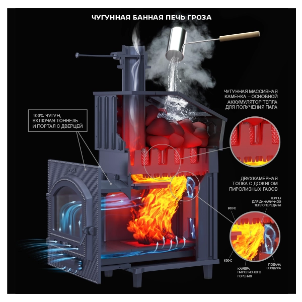 Чугунные банные печи «Гроза» — это современные печи, рассчитанные на малые и средние размеры парных. Печь имеет прочную сборную конструкцию, без резьбовых и сварных соединений, детали выполнены из легированного чугуна. Топка печей «Гроза» состоит из двух камер, разделенных пламегасителем. Радиаторные выступы каменки, направленные вглубь топки, увеличивают площадь контакта огня с каменкой и эффективность теплосъема.