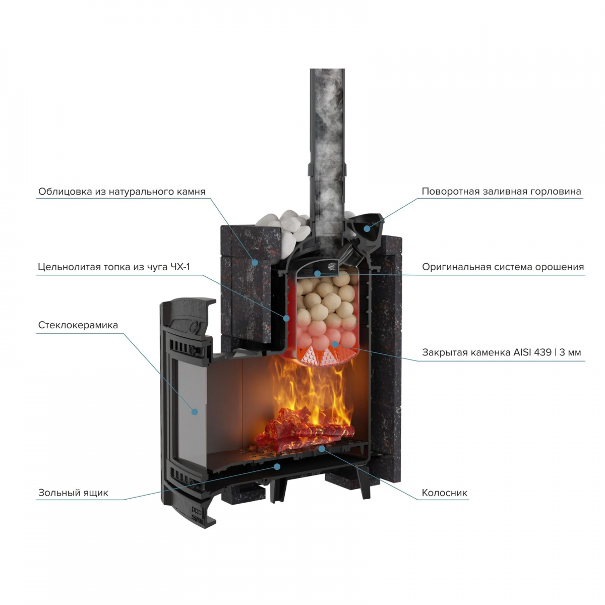 Модель печи в стильной и практичной облицовке из «Амфиболит». За счет использования несущих брусков, состоящих из цельного камня, теплоёмкость печи увеличивается на 50%. Конструкция просто собирается и позволяет легко заменить любую деталь в случае необходимости. Цена и КПД такой облицовки отличаются оптимальным соотношением.