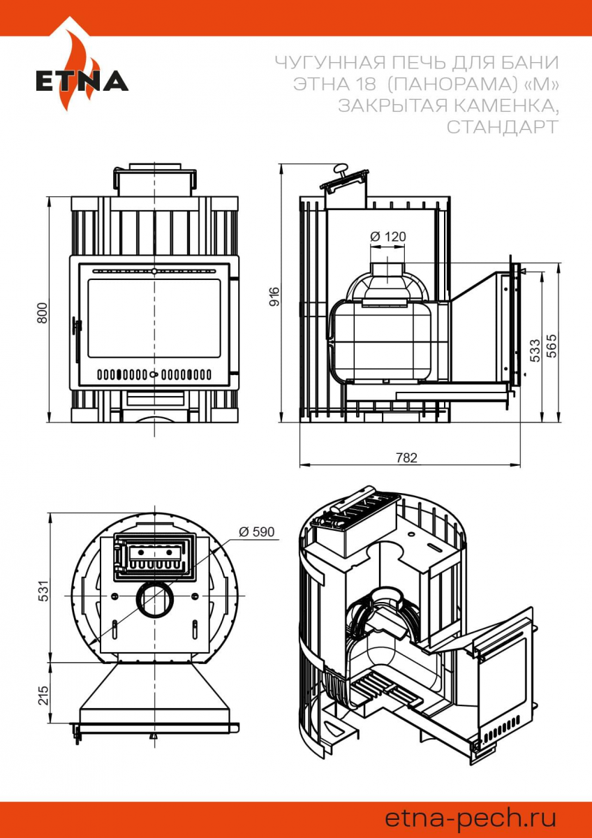 Чугунная банная печь ЭТНА 18 (Панорама) "М" Закрытая каменка, Стандарт со стеклом, с топочным выносом, с открытой камнкой сеткой СТАНДАРТ на 120 кг камней, и закрытой каменкой на 60 кг камней, для обогрева парного помещения бани от 8 до 18 м 3 .