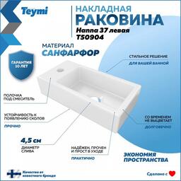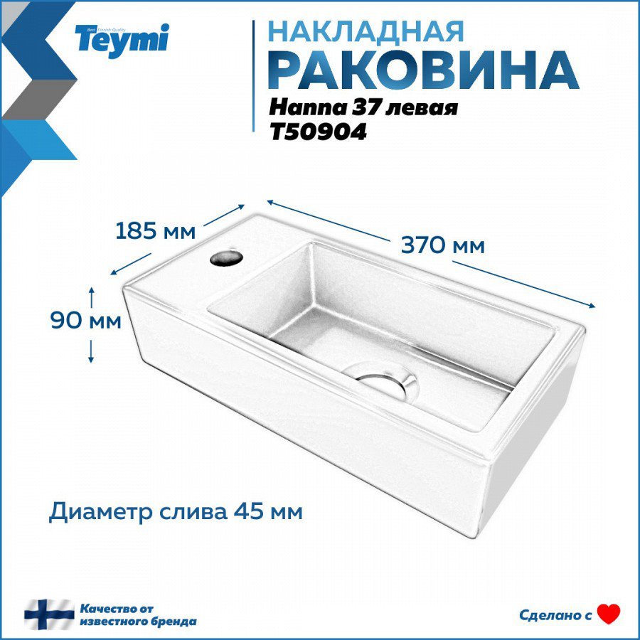 Раковина Teymi Hanna 37 левая - изысканное решение для современной ванной комнаты. Этот белоснежный умывальник, созданный финским брендом, воплощает в себе скандинавскую элегантность и эргономичный подход.