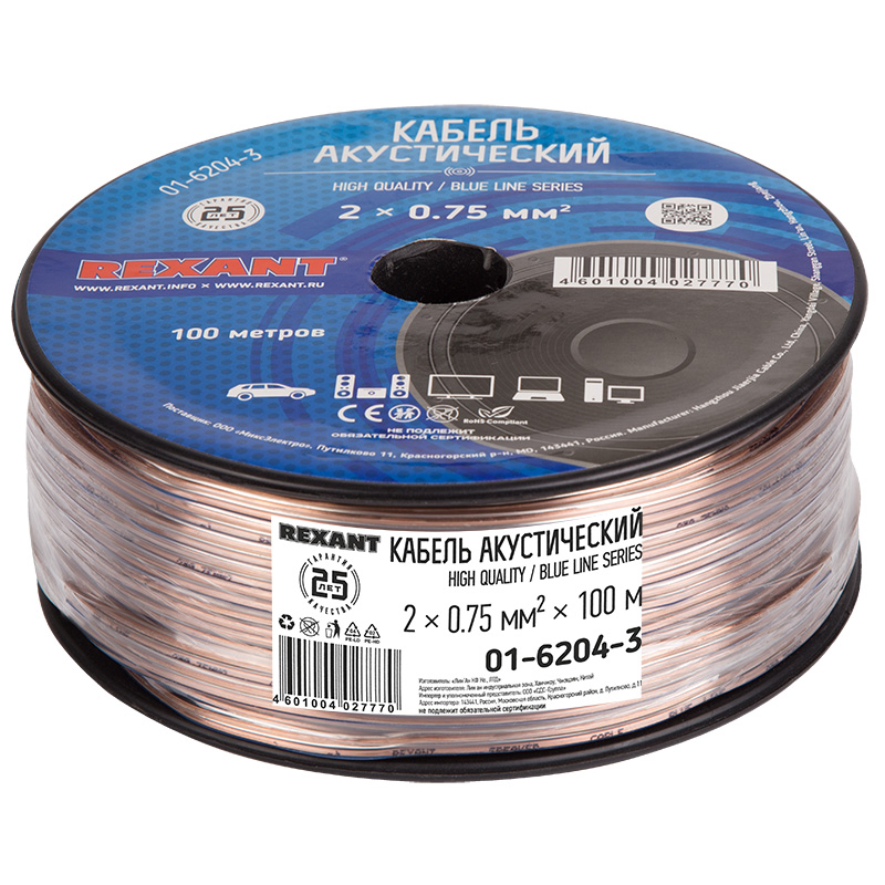 Акустический кабель применяется для подключения звуковых систем и является важным элементом для передачи аудиосигнала. Качественный акустический кабель торговой марки REXANT — залог отличного звука домашней или автомобильной аудиоаппаратуры. Высокое качество изготовления и широкая область применения отличает акустический кабель торговой марки REXANT. Отличное сочетание цены и качества этой продукции порадует любого аудиолюбителя, цель которого — получить чистый звук по выгодной цене.Акустический кабель 2х0,75 мм² Blue Line REXANT состоит из двух параллельных многожильных проводников в изоляции из прозрачного поливинилхлоридного пластиката. Разделительное основание позволяет обеспечить разделение проводников кабеля без повреждения изоляции и оголения жил.