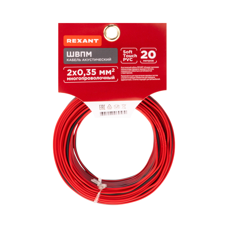Акустический кабель применяется для подключения звуковых систем и является важным элементом для передачи аудиосигнала. Качественный акустический кабель торговой марки REXANT — залог отличного звука домашней или автомобильной аудиоаппаратуры. Высокое качество изготовления и широкая область применения отличает акустический кабель торговой марки REXANT. Отличное сочетание цены и качества этой продукции порадует любого аудиолюбителя, цель которого — получить чистый звук по выгодной цене.Акустический кабель 2х0,35 мм² REXANT состоит из двух параллельных многожильных проводников в изоляции из поливинилхлоридного пластиката красного и черного цвета. Разделительное основание позволяет обеспечить разделение проводников кабеля без повреждения изоляции и оголения жил.
