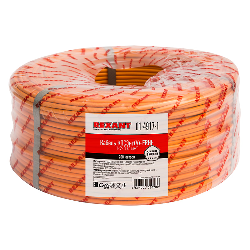 Кабель КПСЭнг(А)-FRHF 1x2x0,75 мм² REXANT симметричный парной скрутки, огнестойкий, безгалогенный, не распространяющий горение при групповой прокладке и не выделяющий коррозионно-активных газообразных продуктов при горении и тлении.Кабель состоит из однопроволочного медного проводника, изоляции из огнестойкой керамизирующейся кремнийорганической резины, дренажного медного проводника, экрана из алюминиевой фольги и оболочки из ПВХ пластиката, не содержащей галогенов. Кабель сохраняет работоспособность в условиях пожара в течение 180 минут. Номинальное напряжение тока до 300 В, частотой 50 Гц.Использование кабеля КПСЭнг(А)-FRHF 1x2x0,75 мм² REXANT регламентирует сертификат соответствия Таможенного Союза (EAC). Применяется для одиночной или групповой прокладки (с учетом объема горючей загрузки) цепей питания электроприемников систем противопожарной защиты, операционных и реанимационно-анестезионного оборудования больниц и стационаров, в местах большого количества скопления людей (больницы, школы, сады, торговые центры, аэропорты, вокзалы, метро), а также в других важных системах жизнеобеспечения, которые должны сохранять работоспособность в условиях пожара.Область применения: - Системы противопожарной защиты;- Системы противодымной защиты;- Охрана пожарной сигнализации (ОПС);- Система оповещения и управления эвакуацией (СОУЭ);- Автоматическая установка пожаротушения (АУПТ).Маркировка КабеляКПСЭнг(А)-FRHF Nх2хS ТУ 27.32.13-001-27284528-2018 REXANT ЕАС РФ (дата, год)где N – число пар, S – cечение токопроводящих жил.