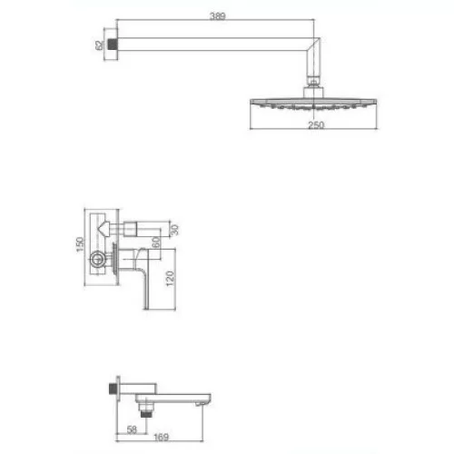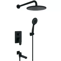 - Комплектация верхний душ, ручной душ (лейка), держатель лейки, шланг, смеситель, излив для ванны