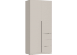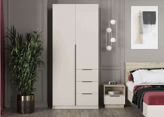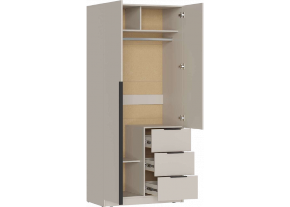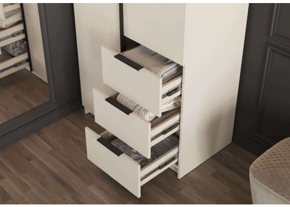 Элегантный дизайн : Накладные фасады шкафа выполнены в стильном цвете "Кашемир". Левая створка и фасады ящиков оснащены черными пластиковыми ручками, а правая створка - без ручки, что добавляет минималистичный акцент.