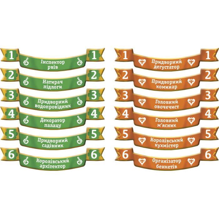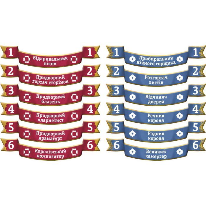 • Комплектація 1 поле уряду, 5 тайлів дворян, 36 тайлів посад, 1 планшет уряду, 108 карток: 54 карти уряду, 15 карт короля, 39 карт золота