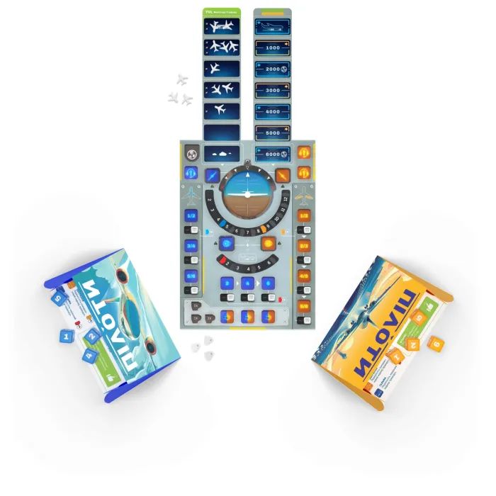 • Комплектація диск осі літака; 2 маркери аеродинаміки; маркер гальм; 4 сині кубики; трек висоти; трек підльоту; 2 жетони перекиду; 12 фішок літака; 3 фішки кави; 2 ширми; бортовий журнал; правила гри
