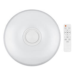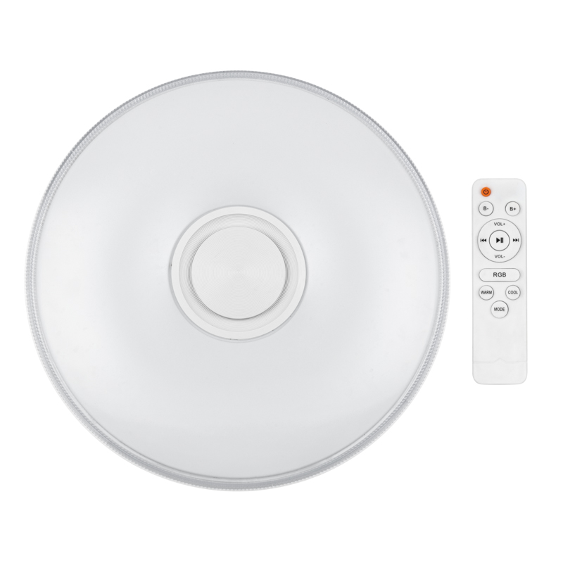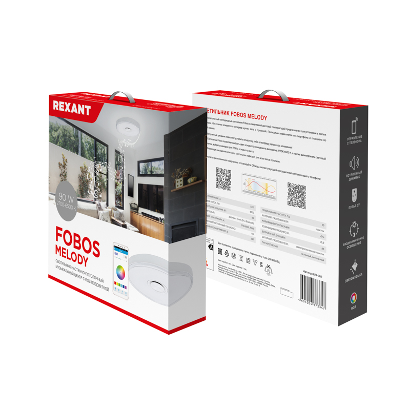 Настенно-потолочный светодиодный светильник REXANT Fobos Melody с изменяемой цветовой температурой предназначен для установки в жилых помещениях. Он отлично впишется в интерьер кухни, зала и прихожей. Полностью управляется с телефона и планшета по Bluetooth каналу. Встроенный динамик позволяет устроить вечеринку и праздничную атмосферу за мгновения!Светильник REXANT Fobos Discoteca позволяет выбрать цвет основного освещения в диапазоне 2700К-6500 К, а также диммировать световой поток, выбрать сценарии для RGB и основного света.Благодаря накладному монтажу, светильник подходит для всех типов потолков.Оживите атмосферу дома одним кликом!Технические характеристики:Тип источника света: LEDСветовой поток: 6300 ЛмДиммируемый: даМощность светильника: 90 ВтЦветовая температура: 2700-6500 КПеременный/постоянный ток (AC/DC): ACНоминальное напряжение: 230 ВНоминальная частота: 50 ГцКласс защиты от поражения током: IIТемпературный режим: +1...+40 °СКоэффициент пульсации: <5%Класс энергоэффективности: AВстроенный динамик: даМатериал рассеивателя: светопропускающий пластикТип крепления: настенный, потолочныйРазмеры, мм (ДхШхВ): 500х500х85
