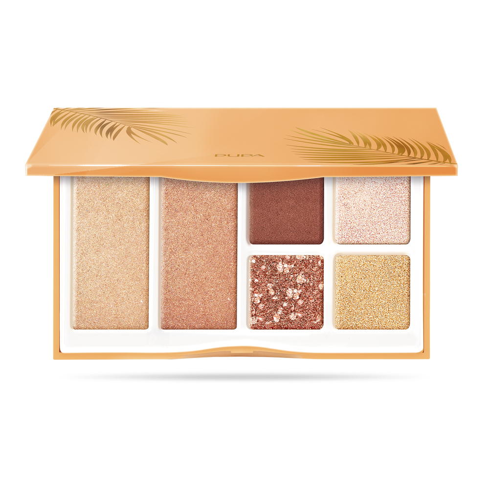 Палитра для создания яркого образа включает 2 хайлайтера для лица (можно смешивать) и 4 оттенка теней для век в коричнево-бронзовых и золотистых оттенках с ультра-пигментированной текстурой.<br>