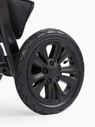 Прогулочный блок оснащён капюшоном до бампера. Бампер с разделителем для ног и пятиточечные ремни с мягкими накладками надёжно фиксируют малыша в коляске. Угол наклона блока, положение спинки и подножки можно отрегулировать. В сесезонная прогулочная коляска с большими надувными колесами. Прогулочный блок устанавливается лицом к родителям или по ходу движения.