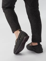 Лаконичные туфли классических цветов легко сочетать с платьями и брюками. Дизайн напоминает балетки, но наличие каблука делает туфли анатомичными и не позволяет ноге «заваливаться» при ходьбе. Благодаря мягким резиночкам обувь плотно держится на ноге, но при этом перемычки легко регулируются и не натирают кожу. Подошва из термопластичной резины хорошо гнется и не дает ногам устать. Верх из полиуретана долго не стирается и позволяет вести активный образ жизни, не переживая за состояние обуви.