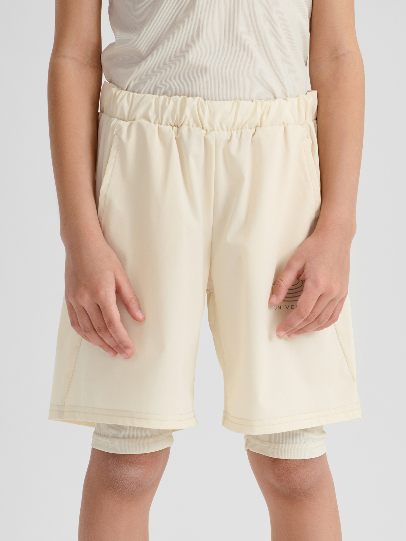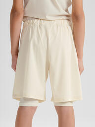Шорты с дизайном, имитирующим многослойность, создают эффект комбинированной модели: сверху — широкие шорты, а под ними — словно велосипедки. Такой стиль напоминает спортивную форму для тренажерного зала, обеспечивая максимальный комфорт и свободу движений. Пояс на резинке гарантирует отличную посадку, а сам дизайн делает шорты не только удобными, но и стильными. Эти шорты идеально подходят для тренировок, активных прогулок или создания необычных спортивных образов.