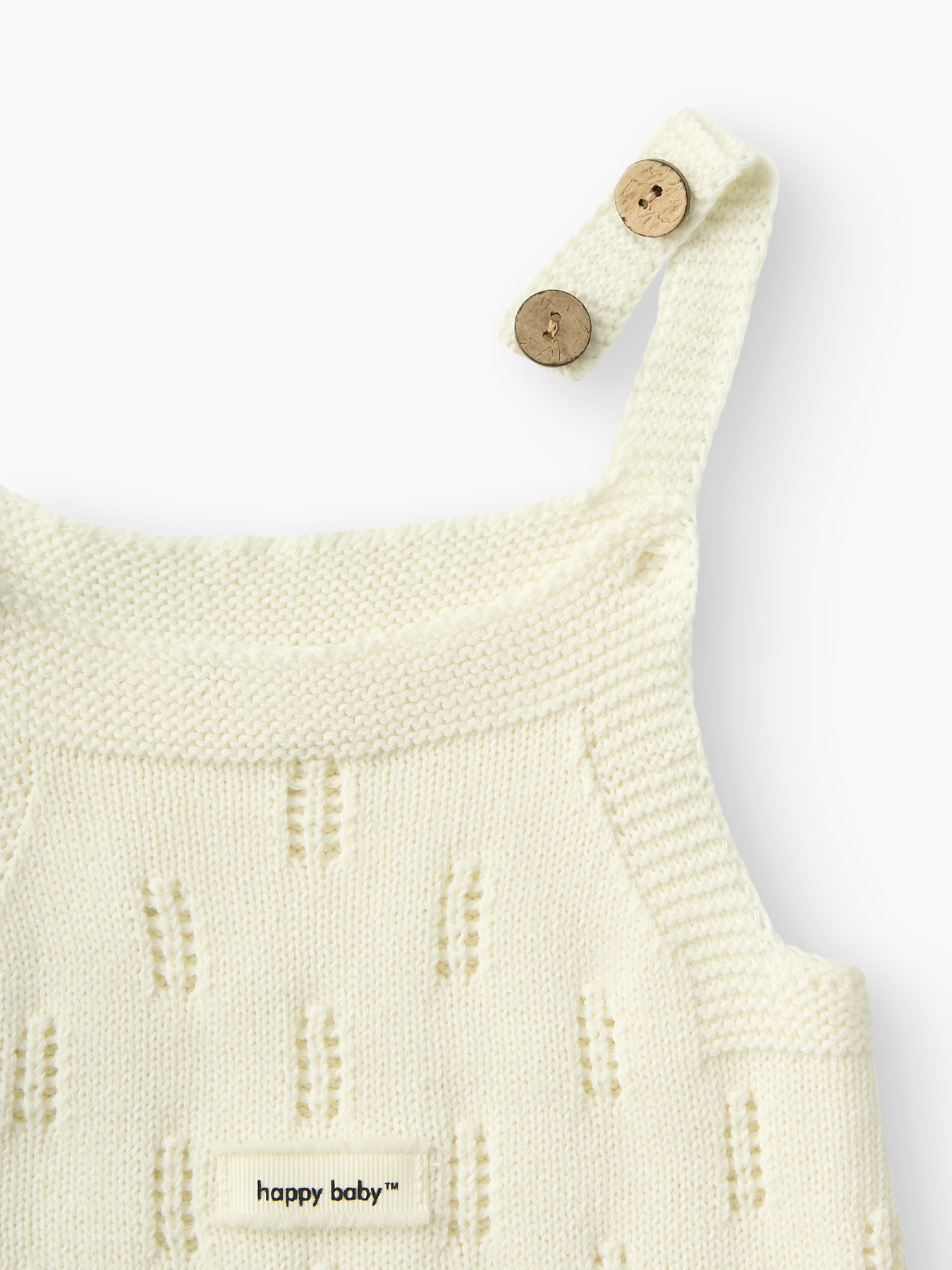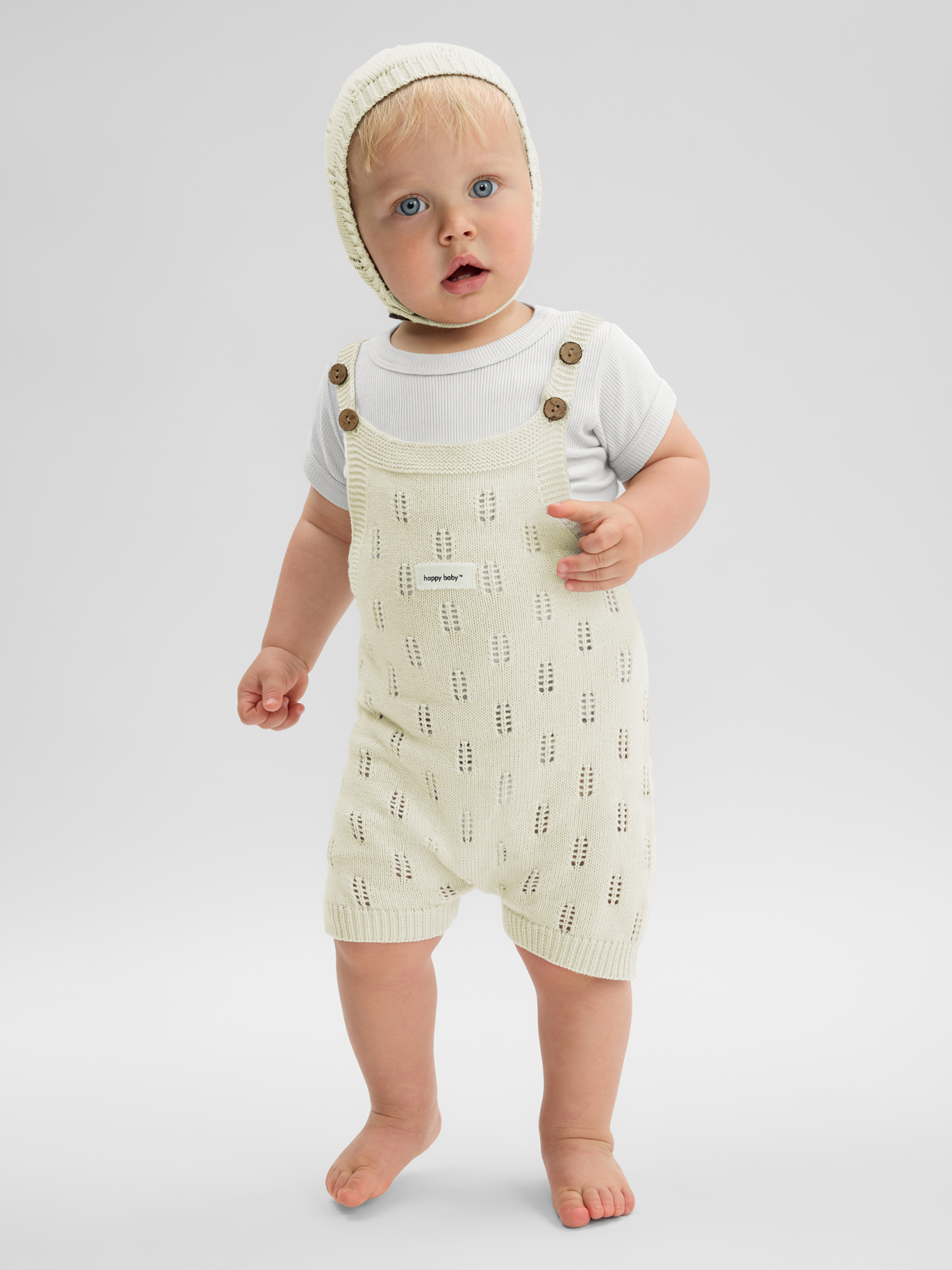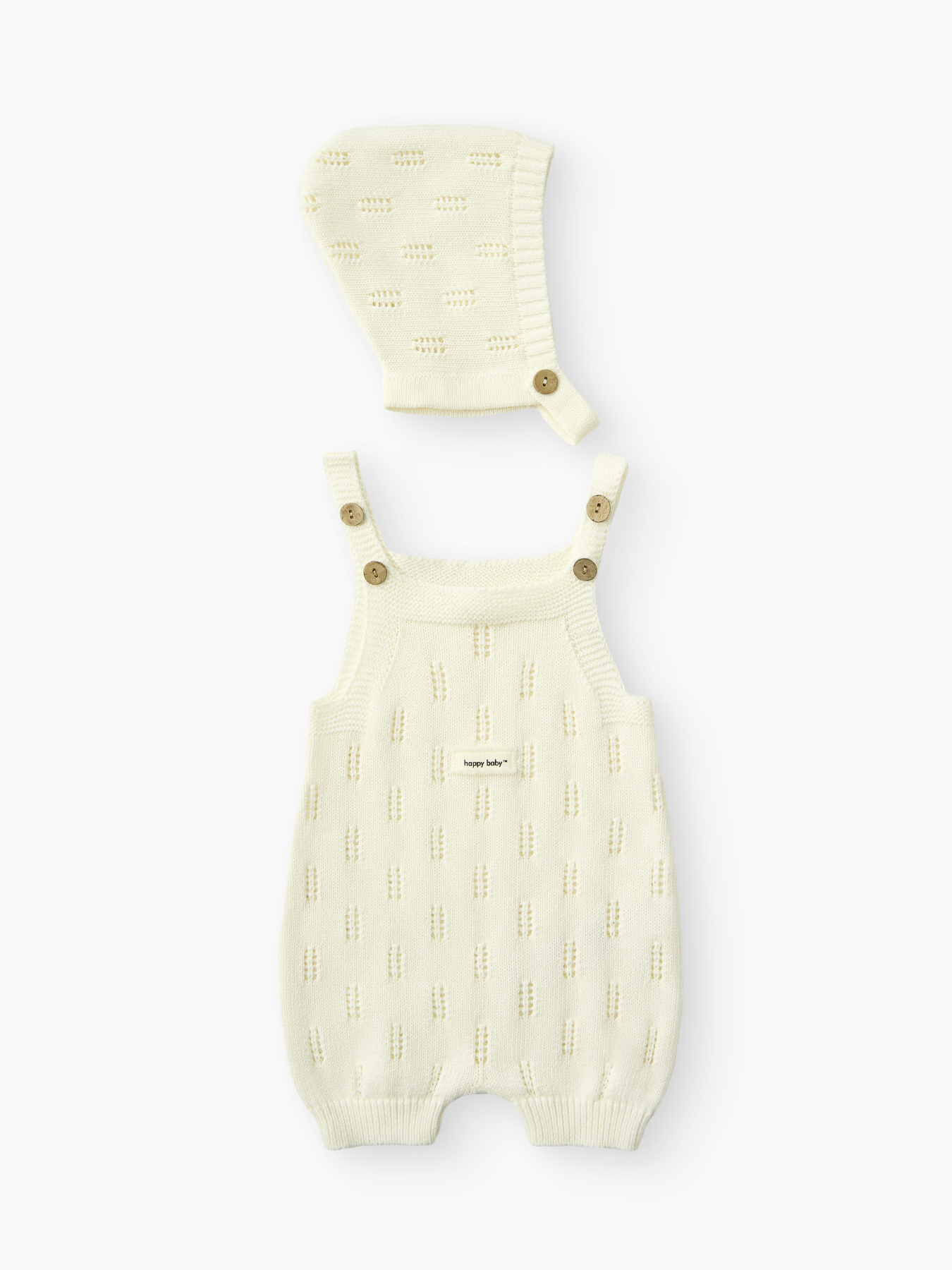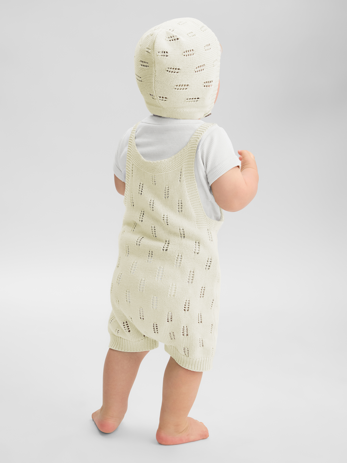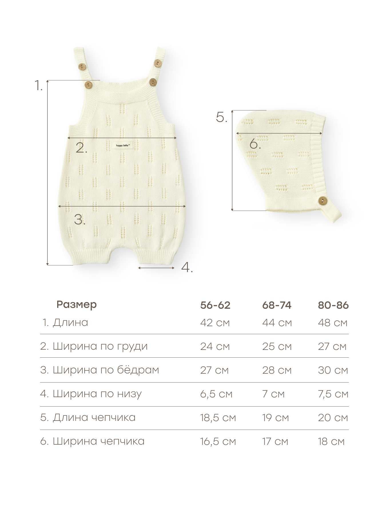 Вязаный набор из комбинезона и чепчика – воплощение нежности и стиля. Комплект легко сочетать с разнообразной одеждой – малыш всегда будет выглядеть очень мило. Чепчик защищает голову и уши от ветра, комбинезон защищает спину и дарит чувство уюта. Комбинезон легко надевать и снимать. Нежный материал приятно касается кожи, не пережимает и не натирает. 100% хлопок, из которого связан комплект, дарит комфорт при любой погоде.