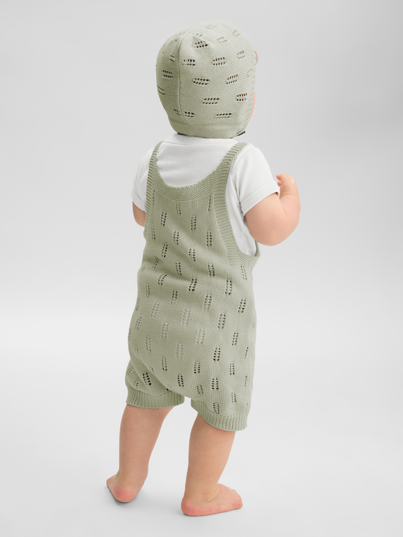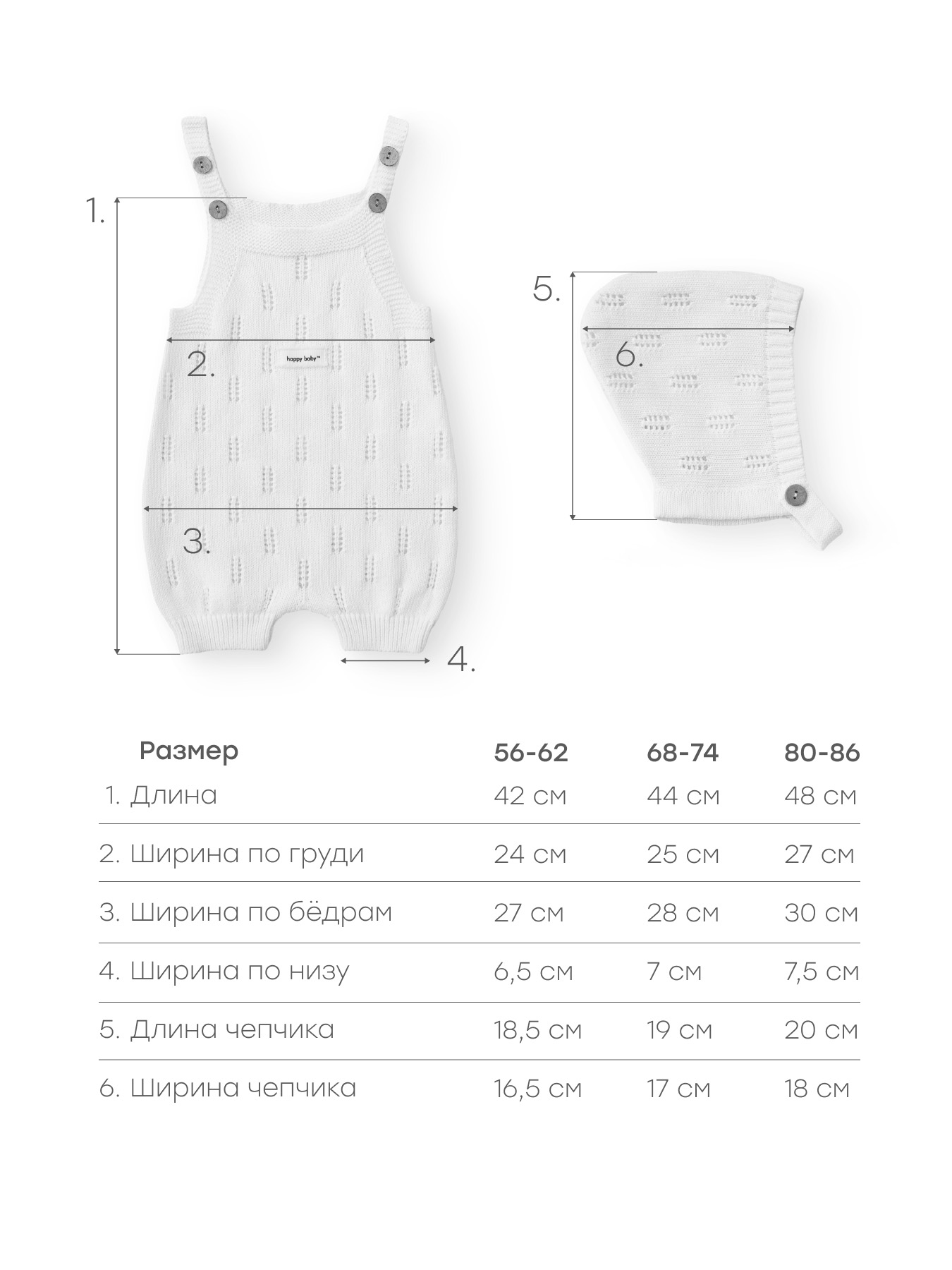 Вязаный набор из комбинезона и чепчика – воплощение нежности и стиля. Комплект легко сочетать с разнообразной одеждой – малыш всегда будет выглядеть очень мило. Чепчик защищает голову и уши от ветра, комбинезон защищает спину и дарит чувство уюта. Комбинезон легко надевать и снимать. Нежный материал приятно касается кожи, не пережимает и не натирает. 100% хлопок, из которого связан комплект, дарит комфорт при любой погоде.