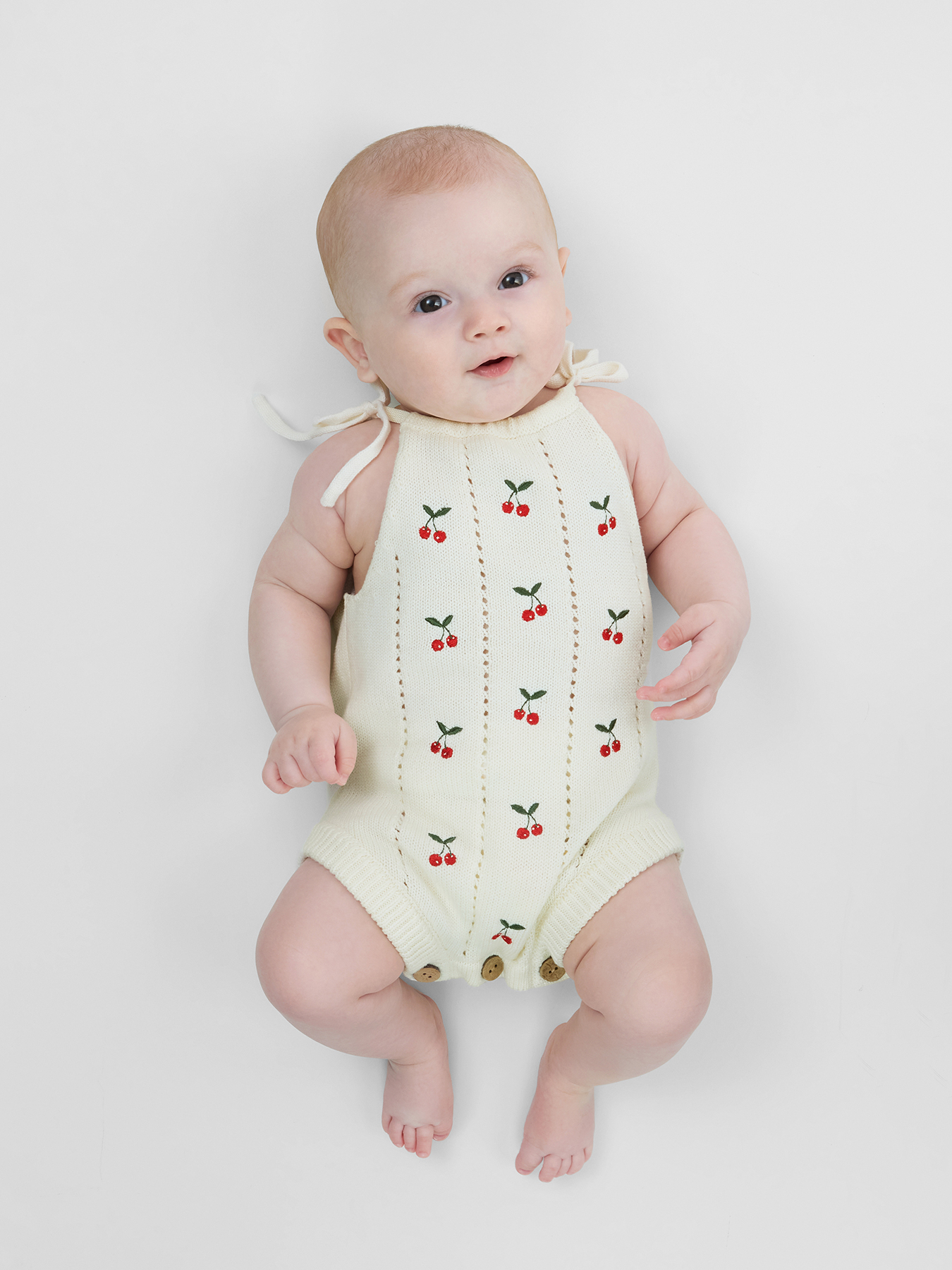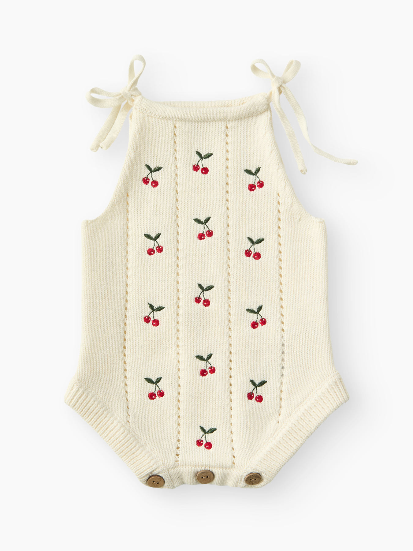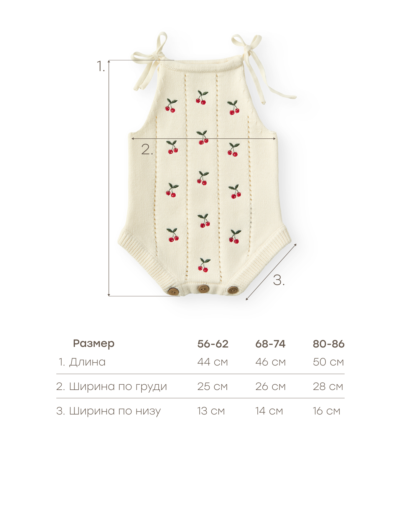 Песочник для новорожденных — это идеальный выбор для первых дней жизни вашего малыша. Универсальный предмет одежды обеспечивает комфорт в первые месяцы жизни. Приятный спокойный цвет в сочетании с яркими вишенками позволит выразить индивидуальность вашей новорожденной девочки, создавая уютный образ. Кроме того, это отличный вариант для семейных фотосессий. Боди на завязках удобно надевается и снимается, а также позволяет подобрать идеальную посадку для ребенка. Застежки - пуговицы помогут молодым родителям быстро сменить подгузник. Материал — 100% хлопок. Вязанная ткань из хлопкового волокна хорошо пропускает воздух и не позволит младенцу запариться или перегреться в непостоянную весеннюю погоду.