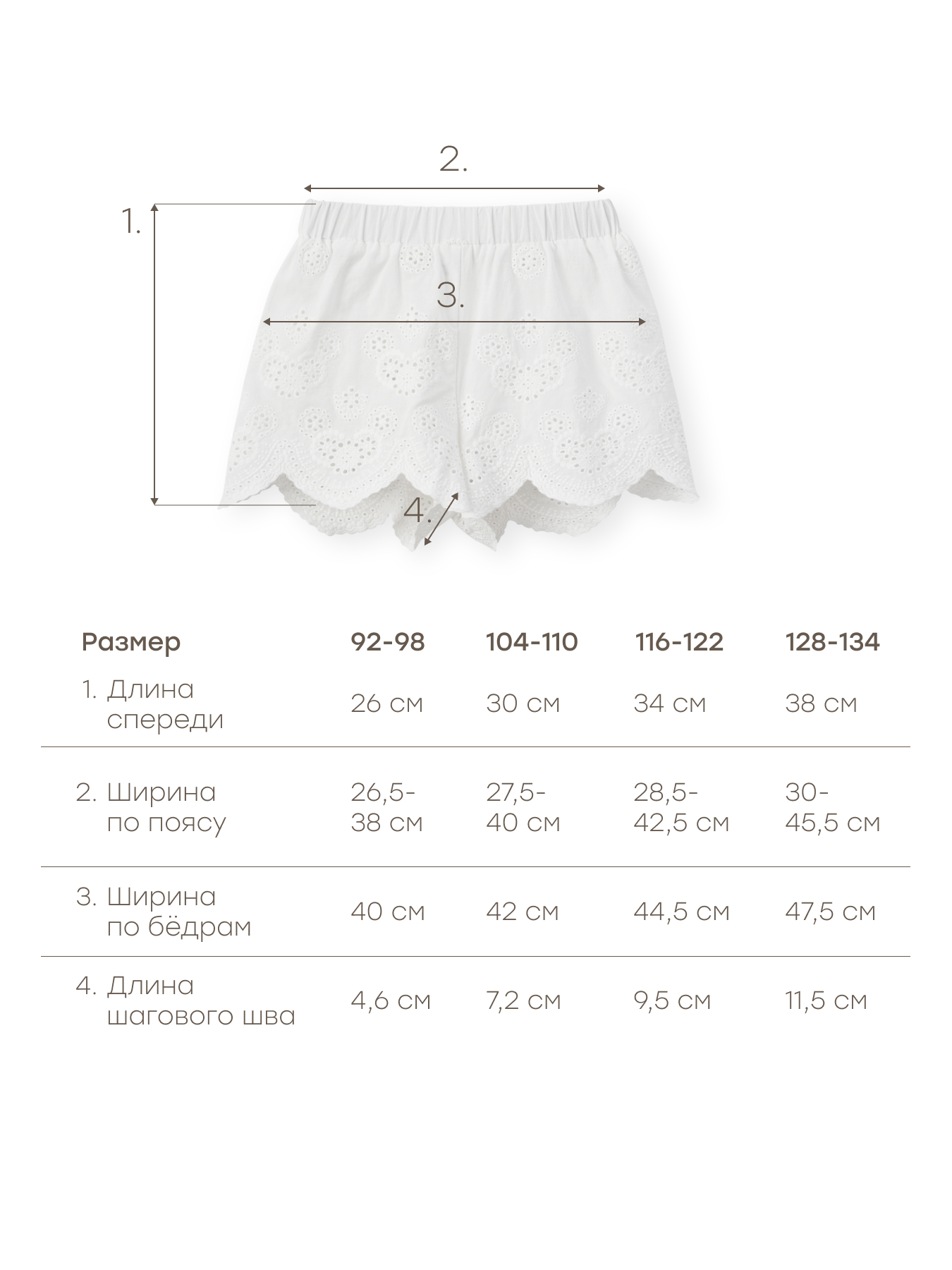 Легкие хлопковые шорты для девочки от Happy Baby - идеальный выбор для жаркой погоды. Свободный крой обеспечивает комфорт и свободу движений, а ажурный рисунок добавляет изысканности. Эластичный пояс на резинке надежно фиксирует шорты детские на талии, не сдавливая и не причиняя дискомфорта. Шорты для девочки универсальны - отлично подойдет как для повседневных прогулок, так и для особых случаев. Легко сочетается с блузками, футболками и топами, создавая стильные и удобные образы.