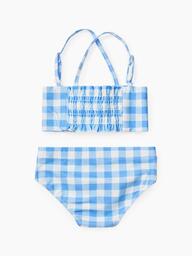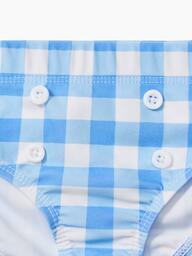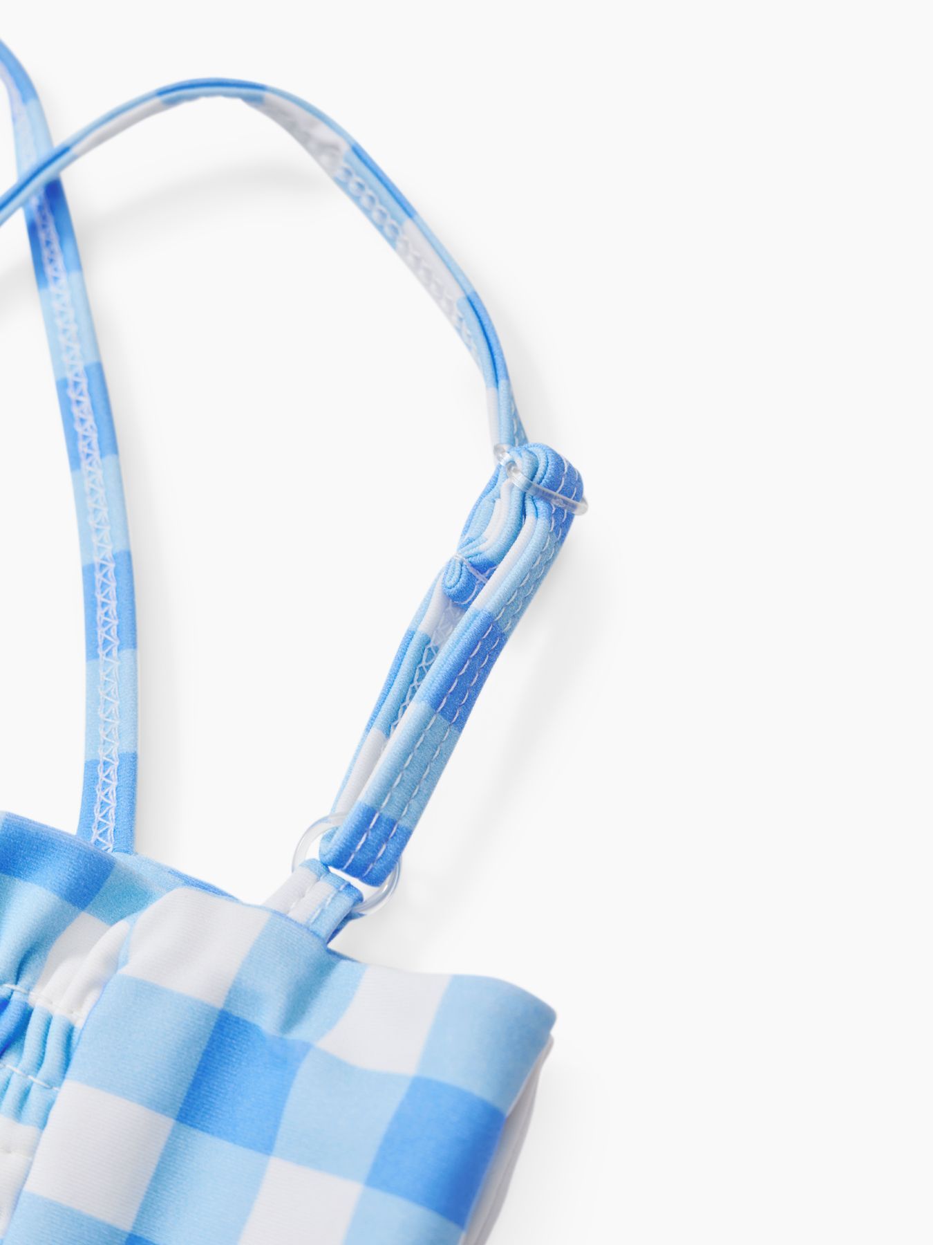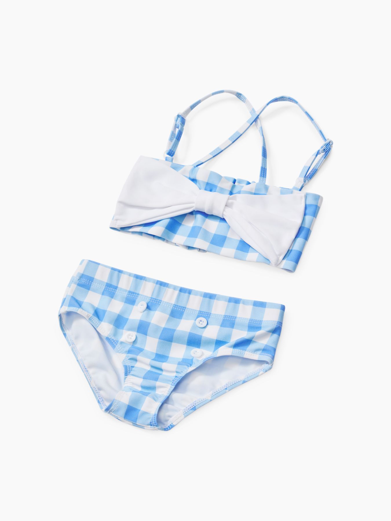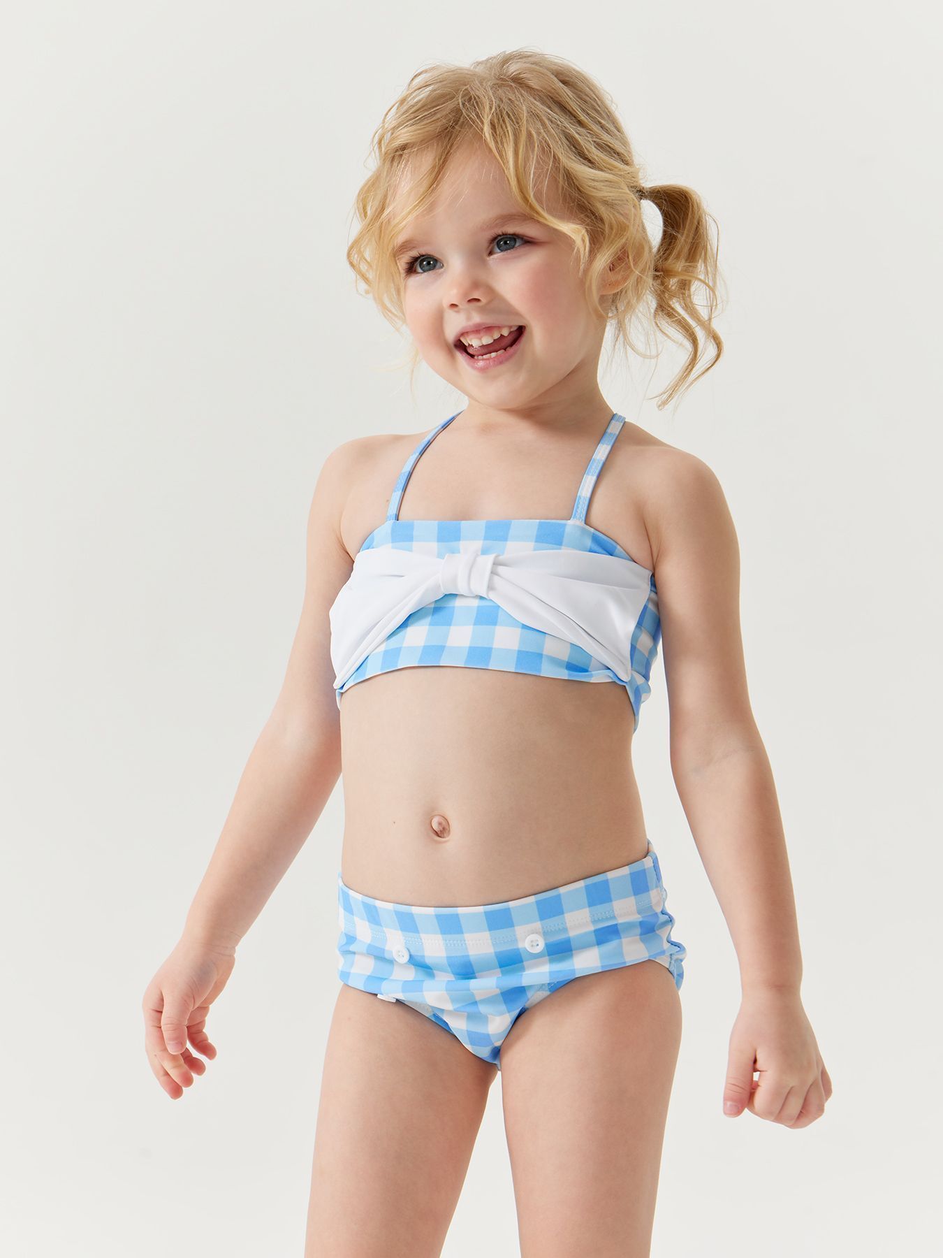 Раздельный купальник в стиле ретро удобен для игр в воде и на суше. Лекало топа обеспечивает правильную посадку и надёжную фиксацию – топ не съезжает и не задирается. Стильные плавки оснащены мягкими резиночками, которые надежно фиксируют купальник и не пережимают нежную детскую кожу. Практичный быстросохнущий материал обладает свойством блокировки ультрафиолета с фактором UPF 50+, что означает наивысшую степень защиты. Актуальный дизайн сделает образ милым, а летние фотографии яркими.