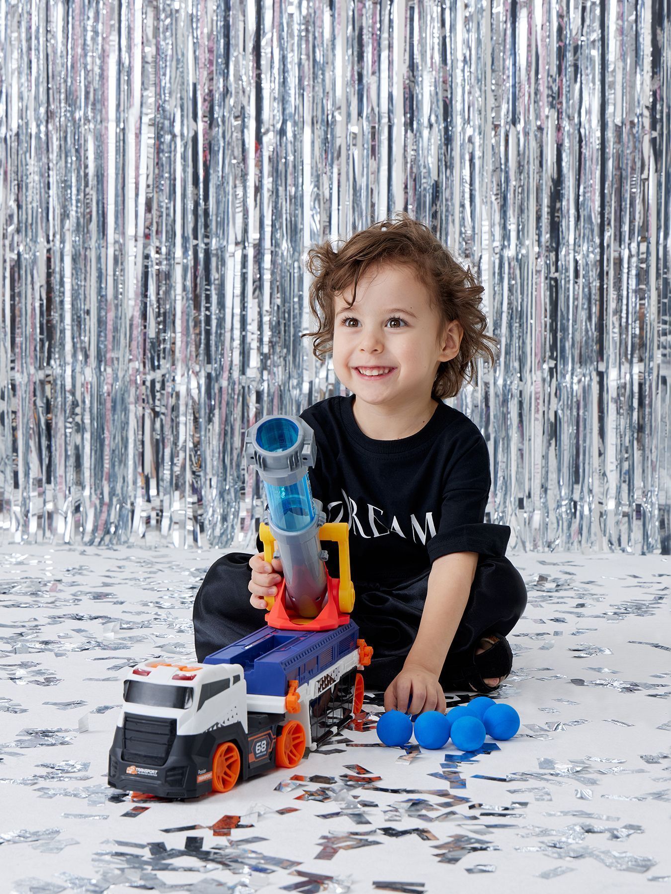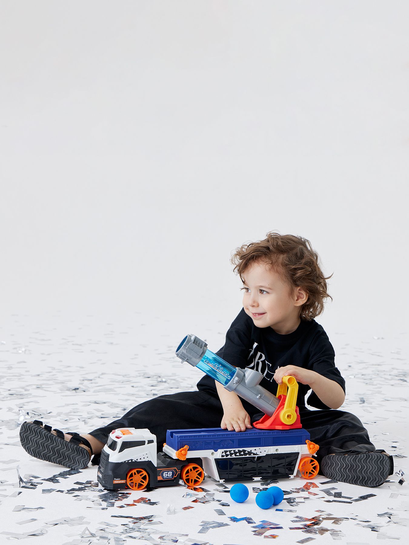 Лучше простой машинки может быть только автовоз. Игрушка с пушкой и машинкой CANNON TRUCK – мечта маленьких автолюбителей. У автовоза лёгкий ход, кабина поворачивается относительно кузова. Пушку, которая стреляет пластиковыми шариками, также можно повернуть. Игра с пушкой развивает мелкую моторику, ловкость и меткость. Кнопки на кабине включают звуковые и световые эффекты. Внутри спрятаны маленькая машинка.