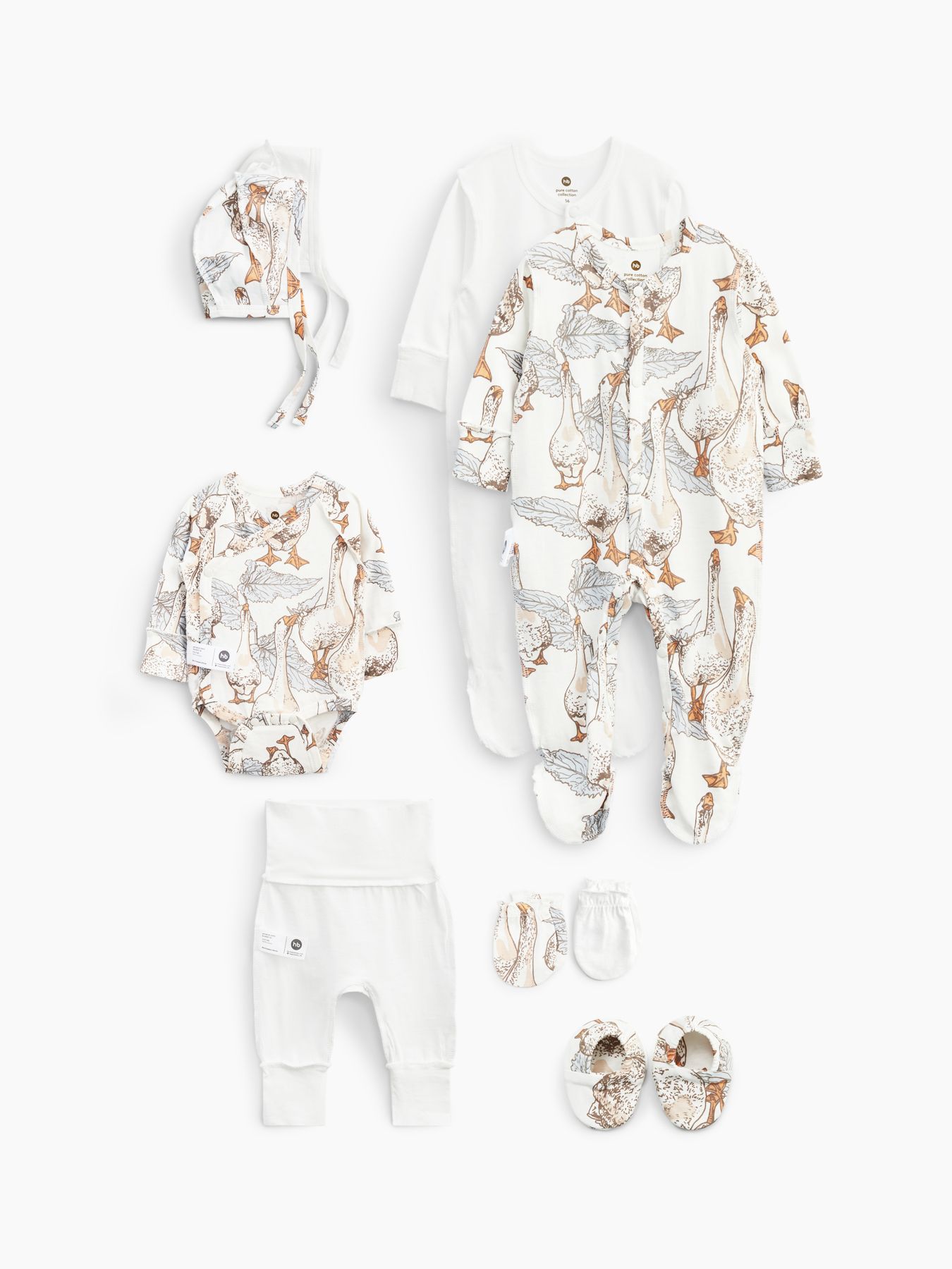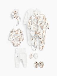 Набор из 9 предметов одежды включает всё необходимое для новорожденного. Комбинезоны, боди и штанишки легко надевать на нежного малыша, не причинив ему дискомфорт и не потревожив пупочную ранку. Лекало создавалось с учетом анатомии детей первого года жизни – в одежде удобно спать, двигаться, осваивать новые умения. Свободная посадка не сковывает движения, есть пространство под подгузник. Комбинезоны и боди оснащены антицарапками. В дополнение к ним в наборе 2 вида рукавичек для малыша. Нежные пинетки и милые чепчики с ушками завершат образ и защитят малыша от холода и сквозняков. Набор 56 размера будет впору даже крупным малышам. Стильный набор из 100% хлопка станет идеальным подарком для новорожденного любого пола.