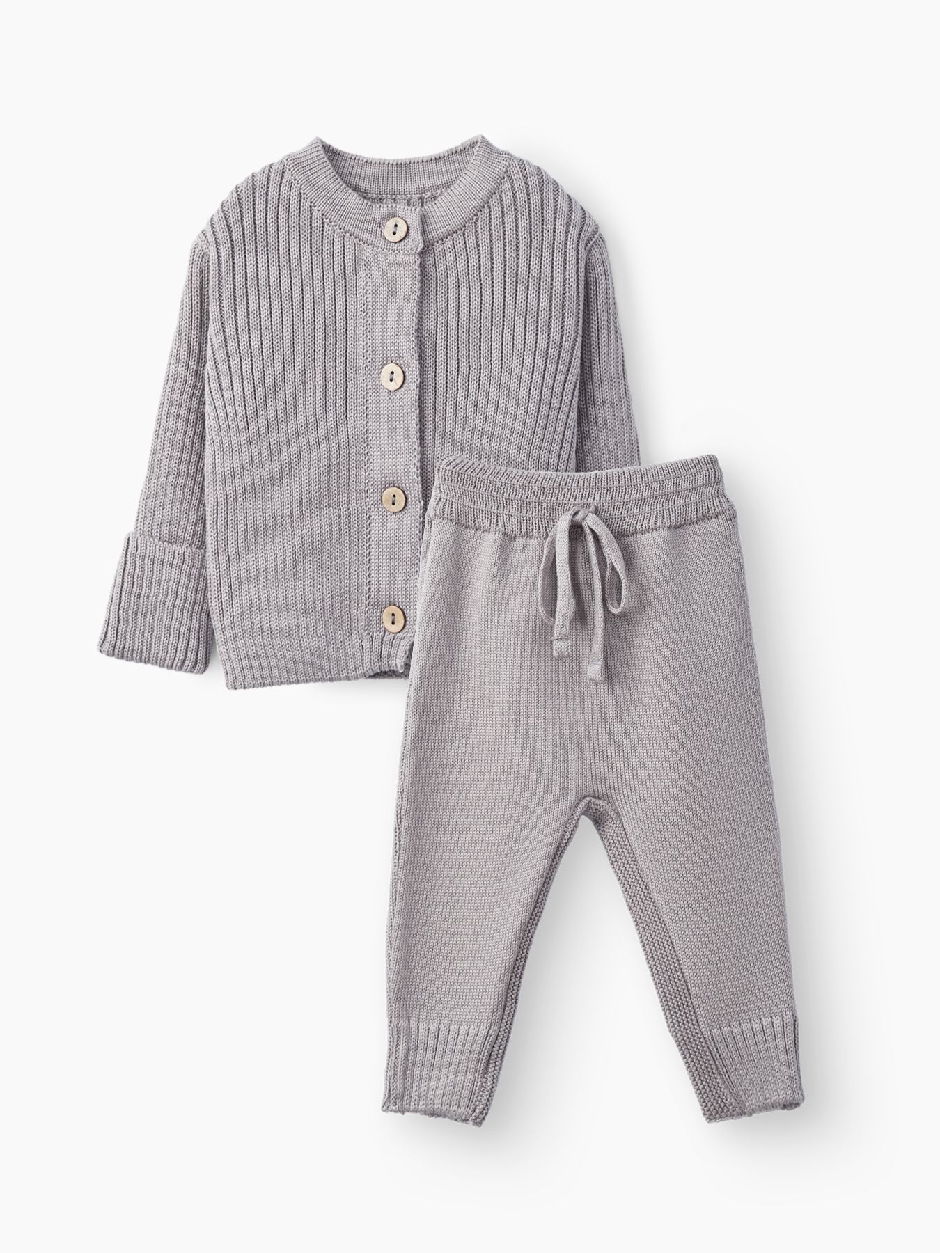 Уютный вязаный костюм согреет малыша. В составе 50% хлопка, чтобы крохе не было жарко. Лекала изготавливали с учетом анатомии самых маленьких, потому в костюме удобно двигаться и спать, есть пространство под подгузник. Джемпер застегивается на пуговицы. Горловина укреплена, но хорошо тянется. У штанишек есть шнурок для правильной посадки по фигуре.