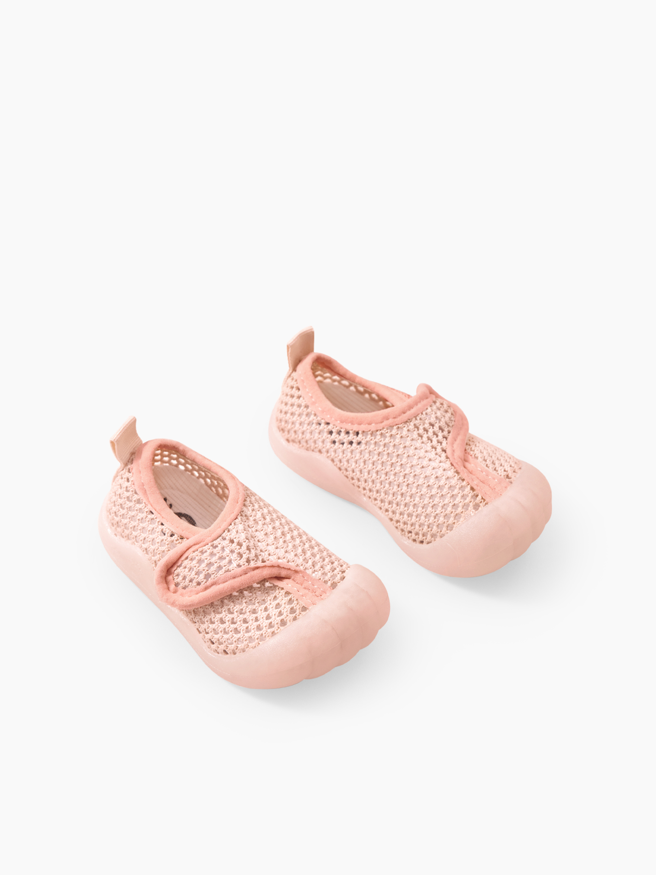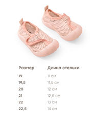 Летние кроссовки – удобная обувь для самой жаркой погоды. Благодаря полностью сетчатому материалу верха не дают ножкам вспотеть. Невесомая подошва из ПВХ заходит на носок, чтобы защитить пальчики крохи. Анатомически правильная конструкция: пятка слегка приподнята по отношению к носку, жёсткий задник, круглый носок. Благодаря этому стопы малыша развиваются правильно. Простая и удобная застёжка – липучка – позволит быстрее собирать малыша.