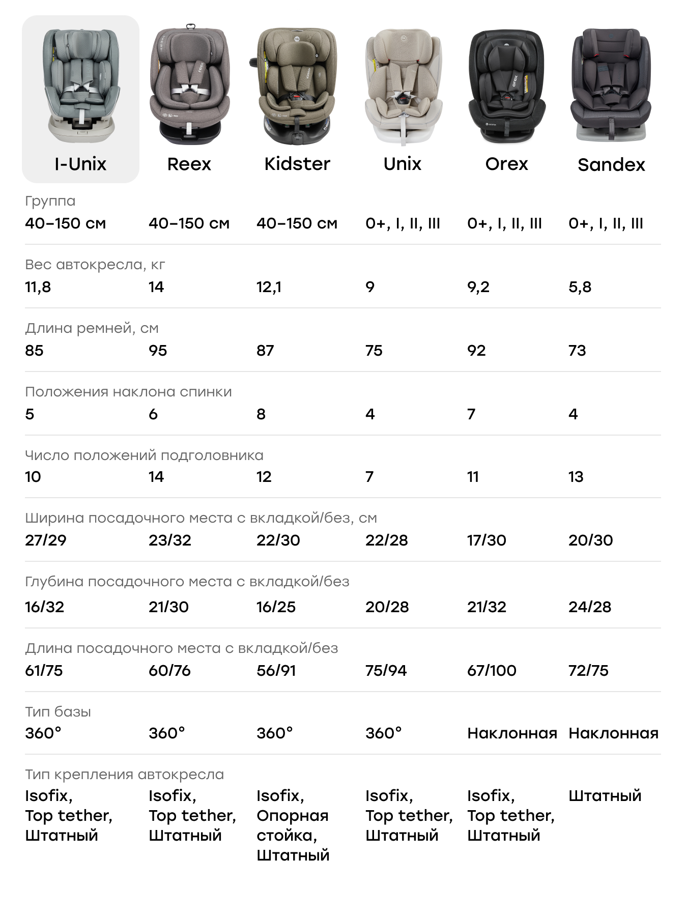 UNIX - универсальное автокресло для детей с самого рождения и до 12 лет, которое имеет возможность установки как с помощью трехточечных ремней безопасности автомобиля, так и с помощью системы ISOFIX. Различные варианты установки и поворотная база предлагают широкие возможности для наиболее удобного и безопасного расположения в любом автомобиле.