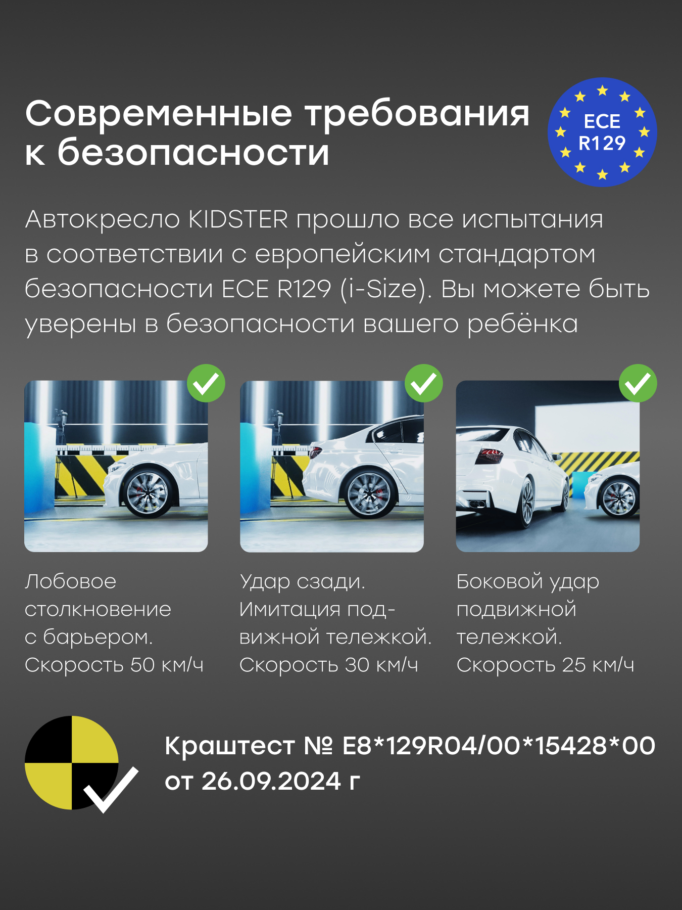 Автокресло проходит обязательные краш-тесты (номер краштеста: E8*129R04/00*15428*00 от 26.09.2024 года) при сертификации (сертификат безопасности детских кресел ECE R129/04)