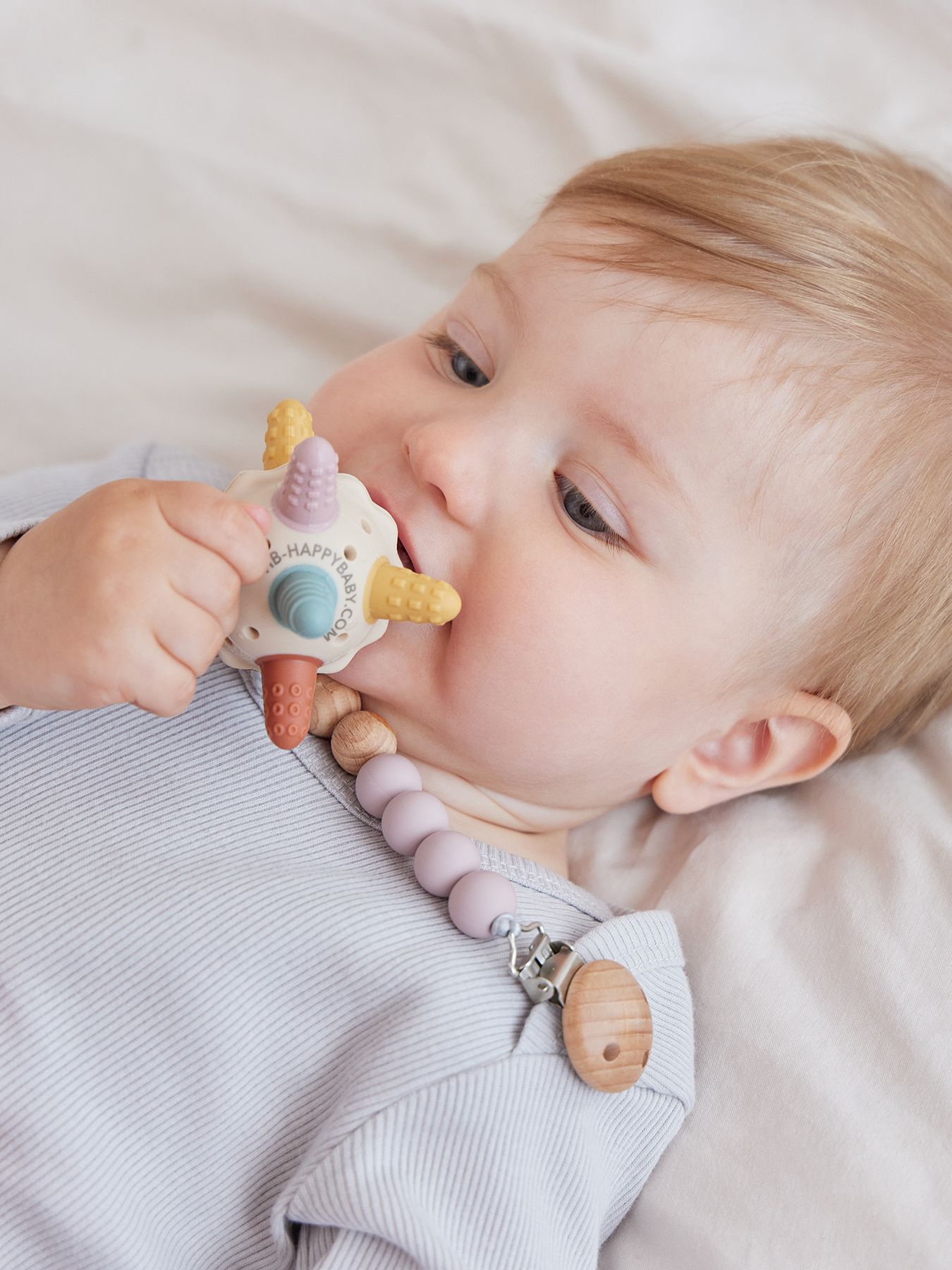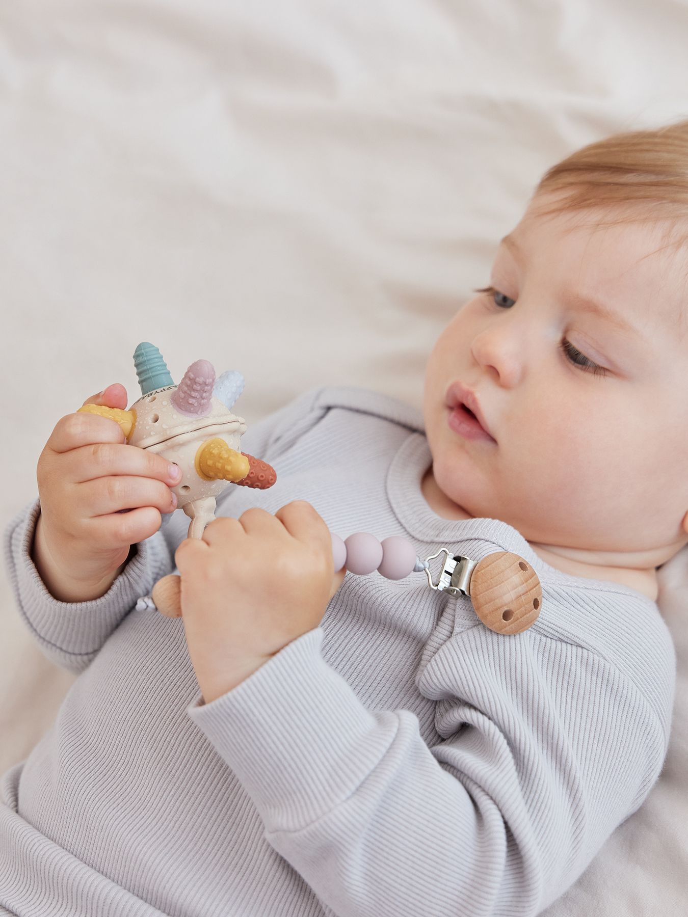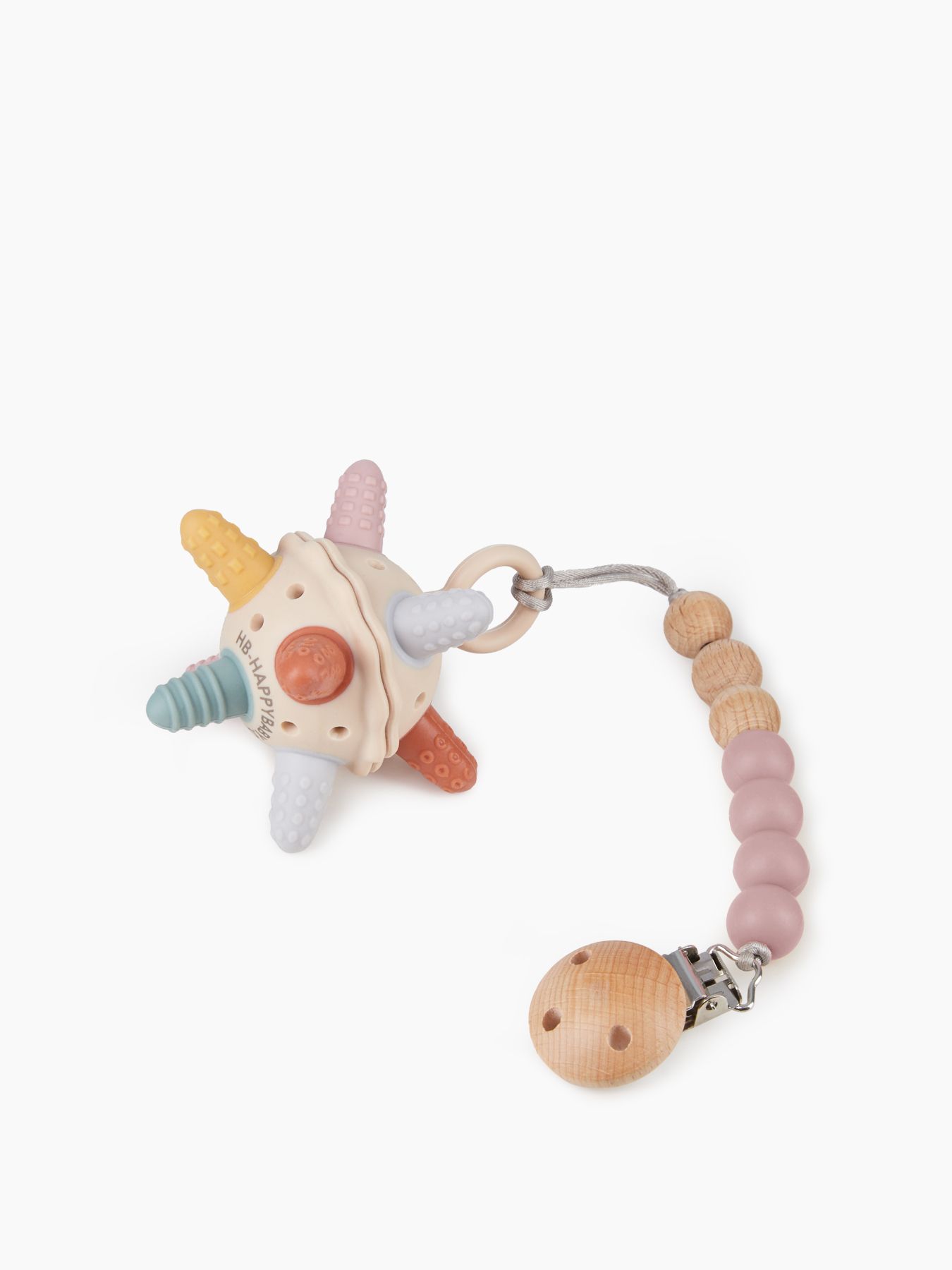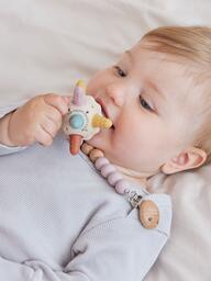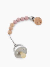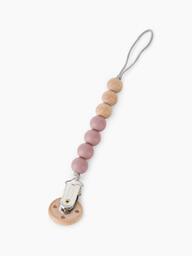 Держатель с бусинками из мягкого силикона, натурального дерева и с надёжным креплением-прищепкой - теперь вы можете быть уверены, что пустышка или прорезыватель не потеряются и всегда будут чистыми. Компактный держатель удобно брать с собой на прогулки и в длительные поездки.