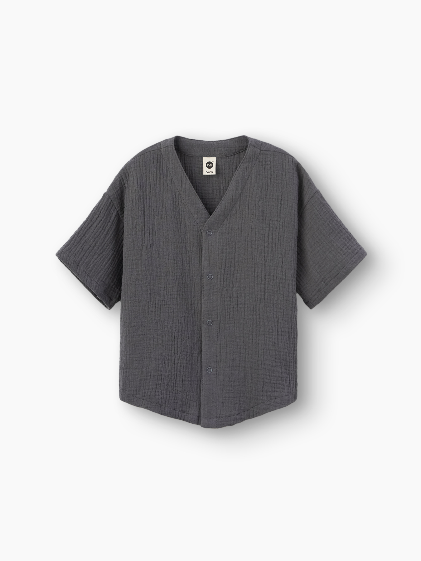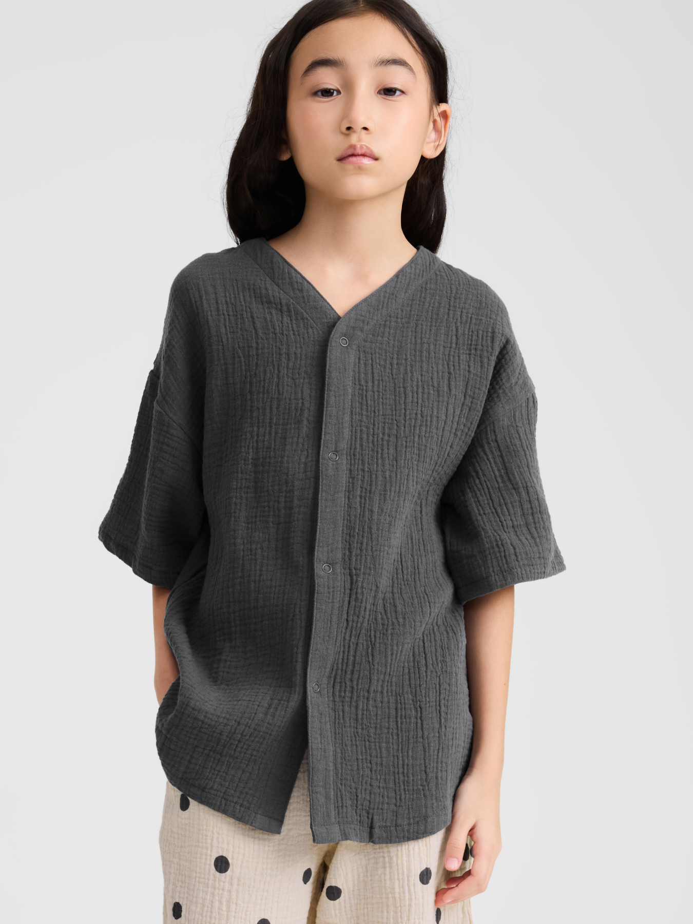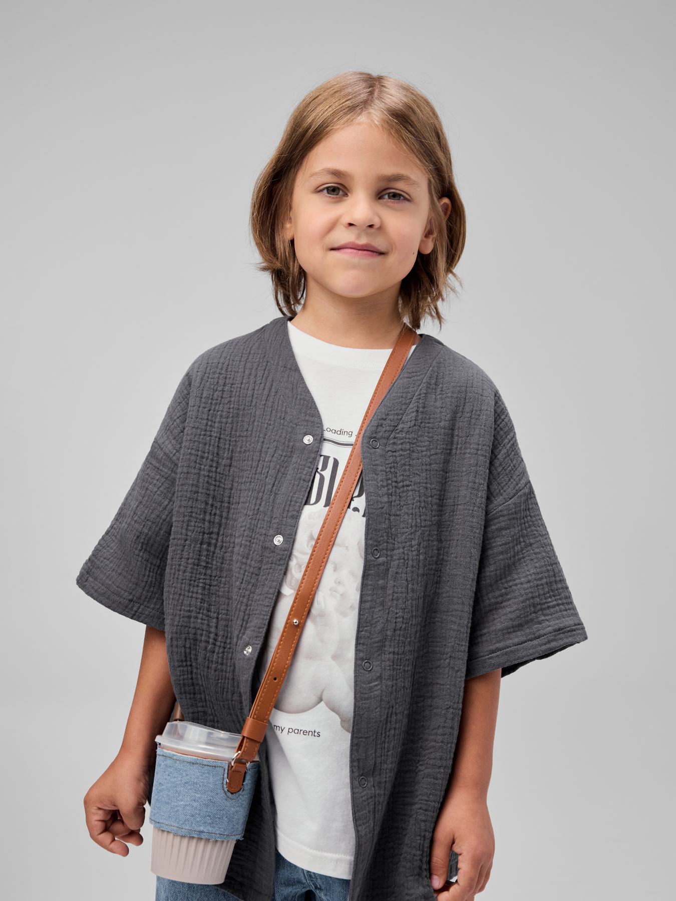 Рубашка из муслина с коротким рукавом подойдет девочкам и мальчикам. Тонкий и приятный на ощупь материал отличается высокой гигроскопичностью, обеспечивая комфорт в любую погоду. Свободный крой не стесняет движений, что делает эту модель универсальной для любых активностей. Светлая рубашка легко впишется в повседневные образы и станет базовым элементом гардероба, подходящим для города, пляжа или отдыха на природе. Можно носить как самостоятельный элемент или накинуть на плечи, дополнив купальный костюм или майку.