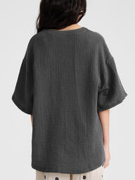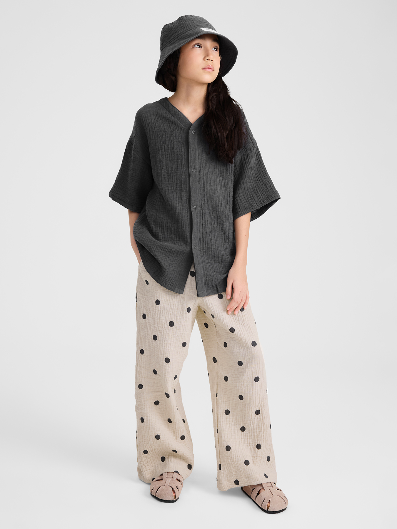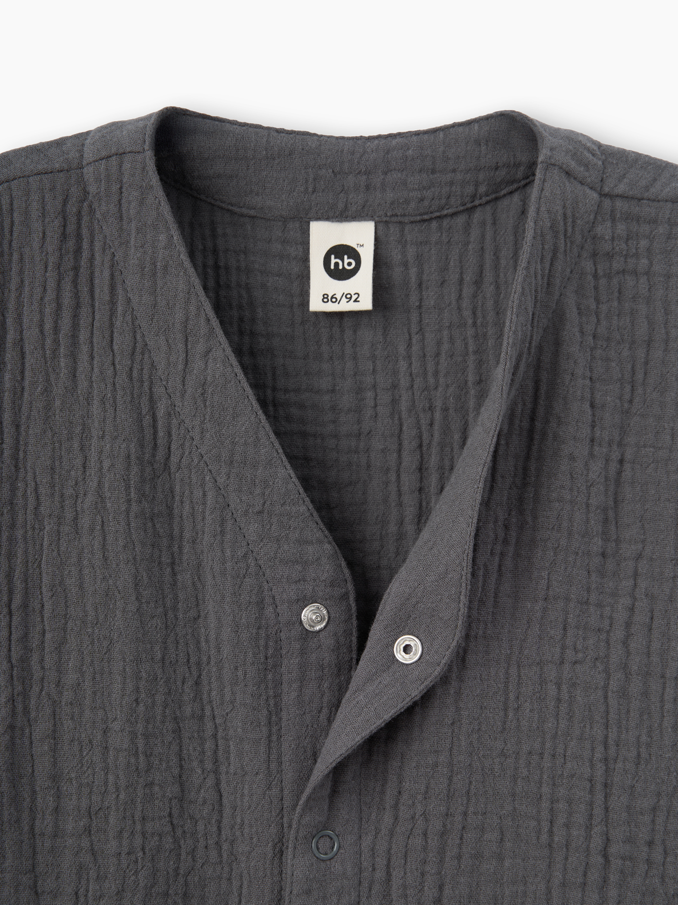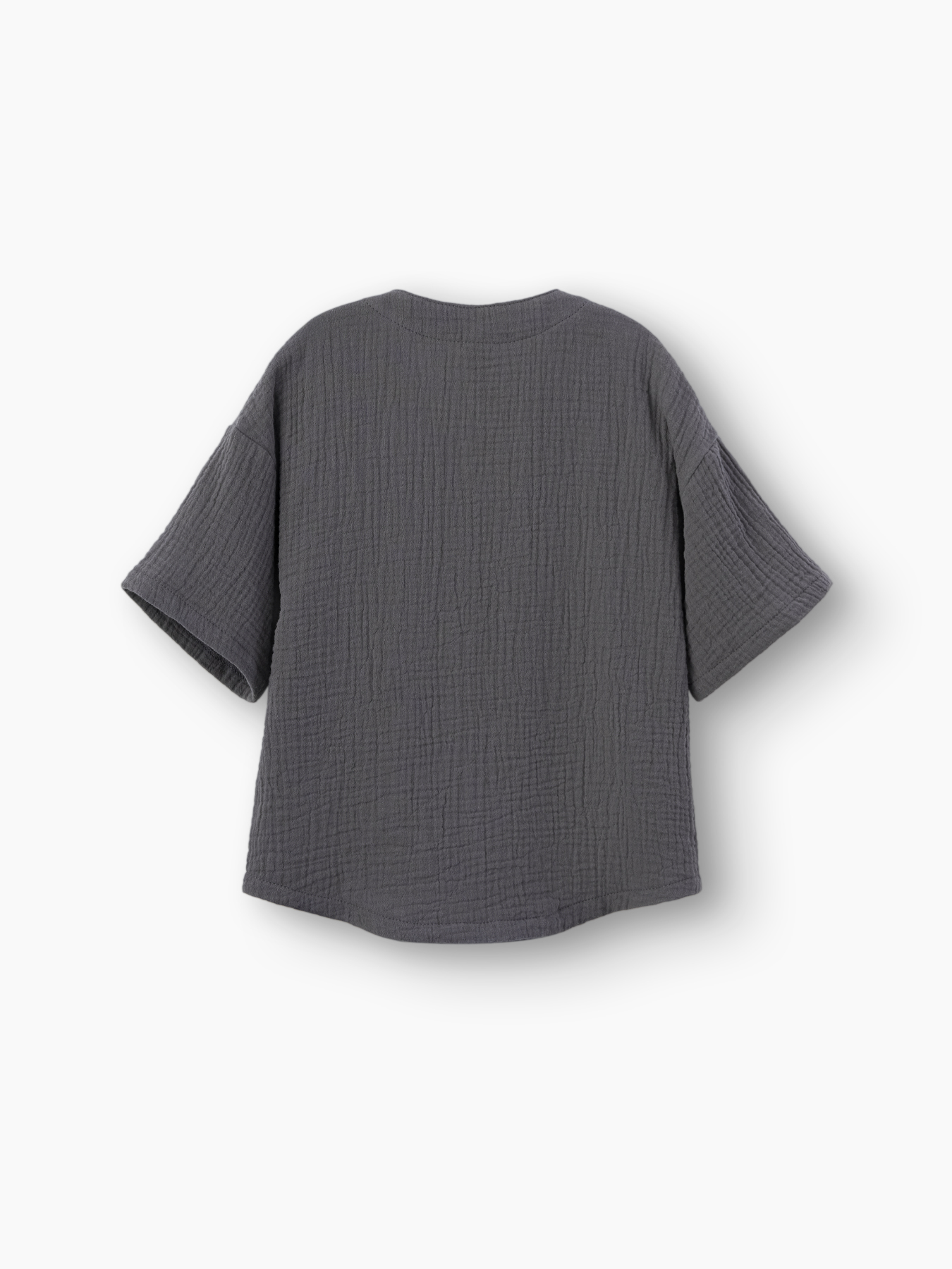 Рубашка из муслина с коротким рукавом подойдет девочкам и мальчикам. Тонкий и приятный на ощупь материал отличается высокой гигроскопичностью, обеспечивая комфорт в любую погоду. Свободный крой не стесняет движений, что делает эту модель универсальной для любых активностей. Светлая рубашка легко впишется в повседневные образы и станет базовым элементом гардероба, подходящим для города, пляжа или отдыха на природе. Можно носить как самостоятельный элемент или накинуть на плечи, дополнив купальный костюм или майку.