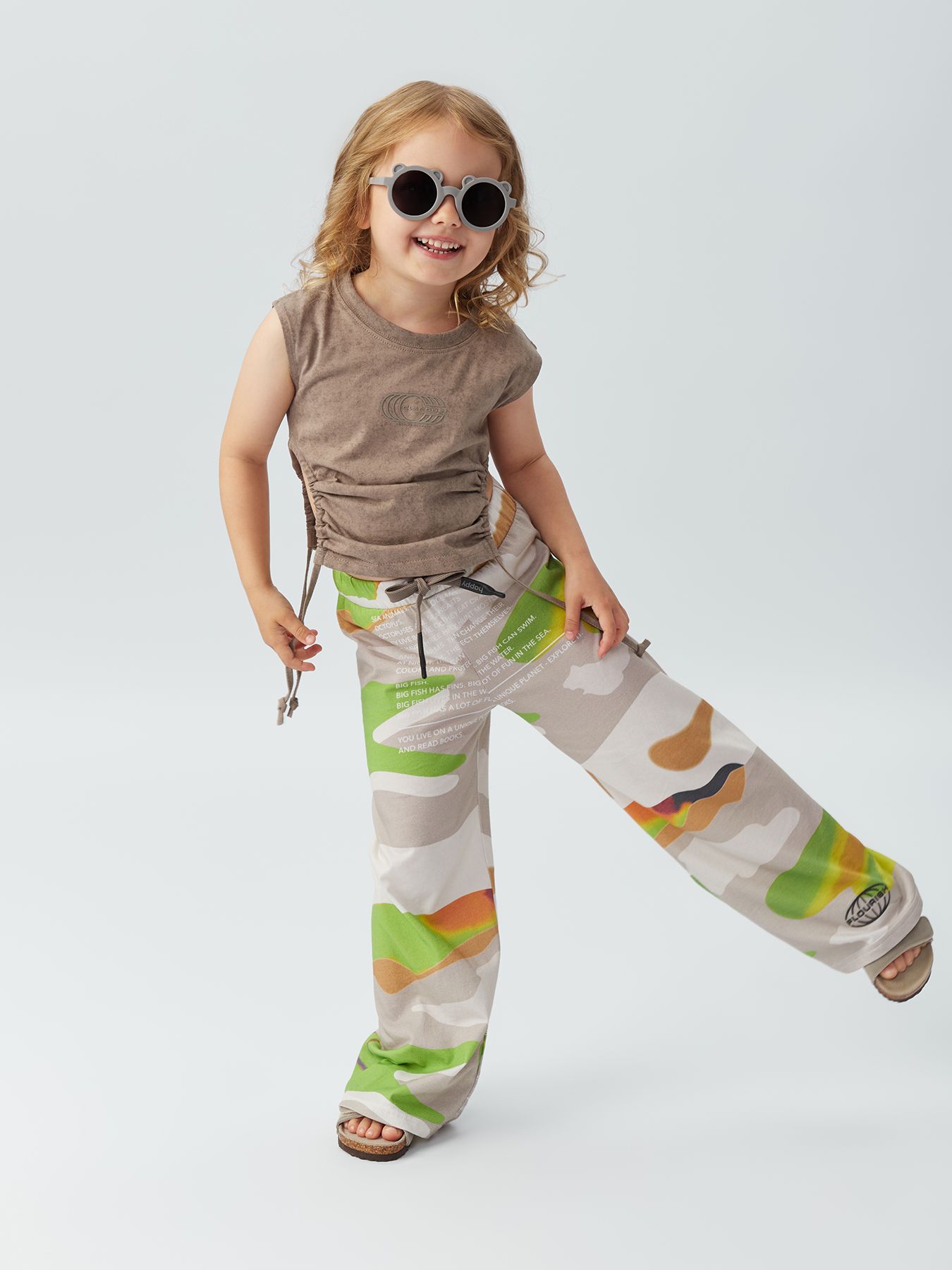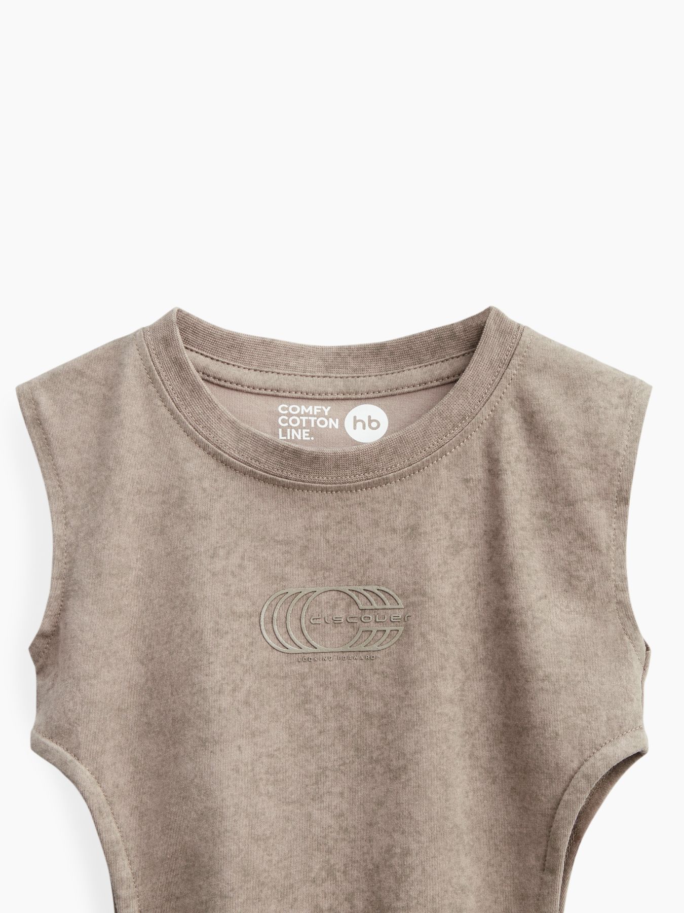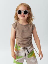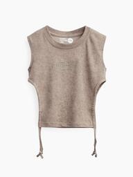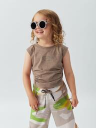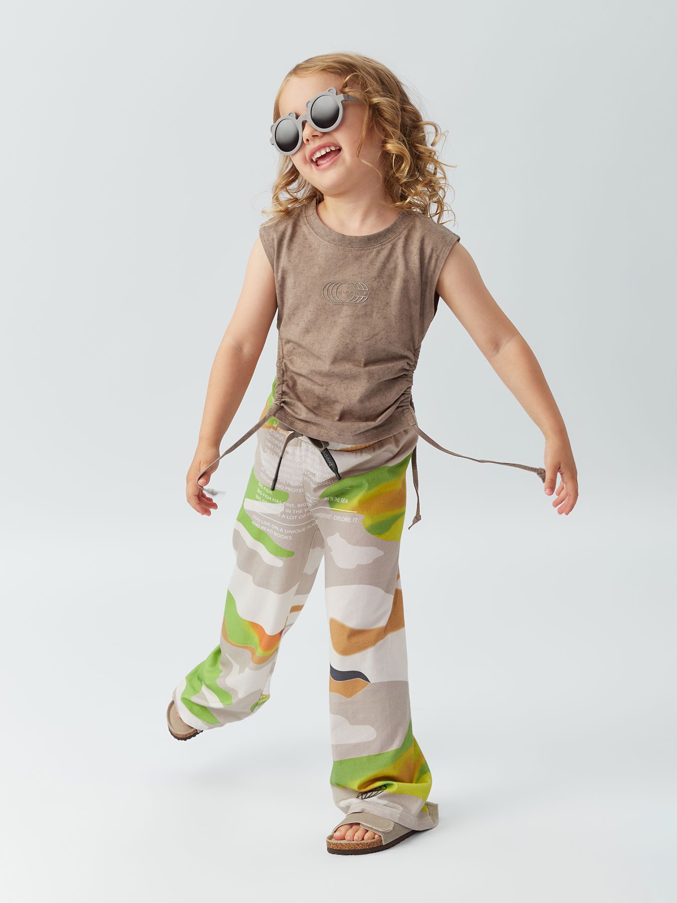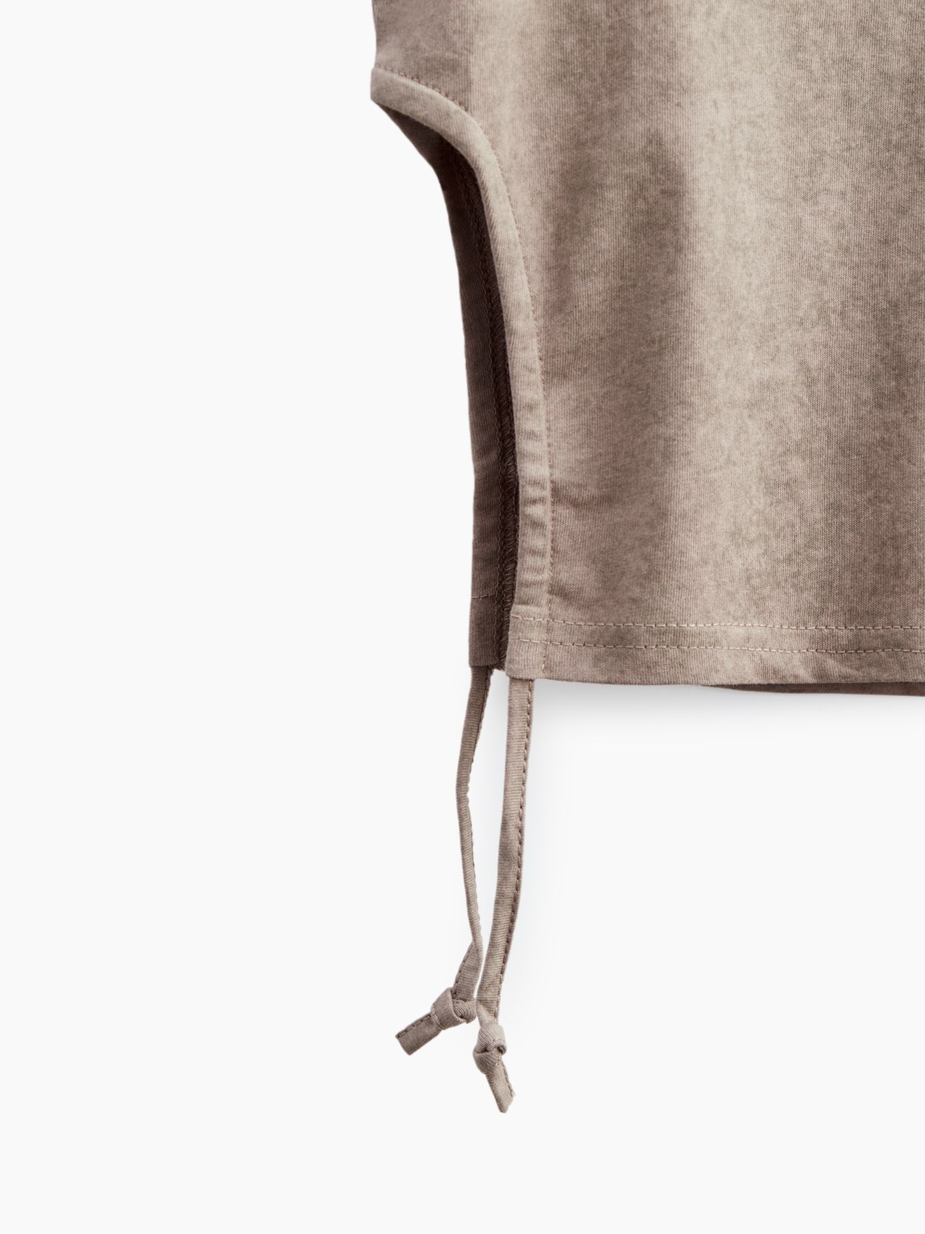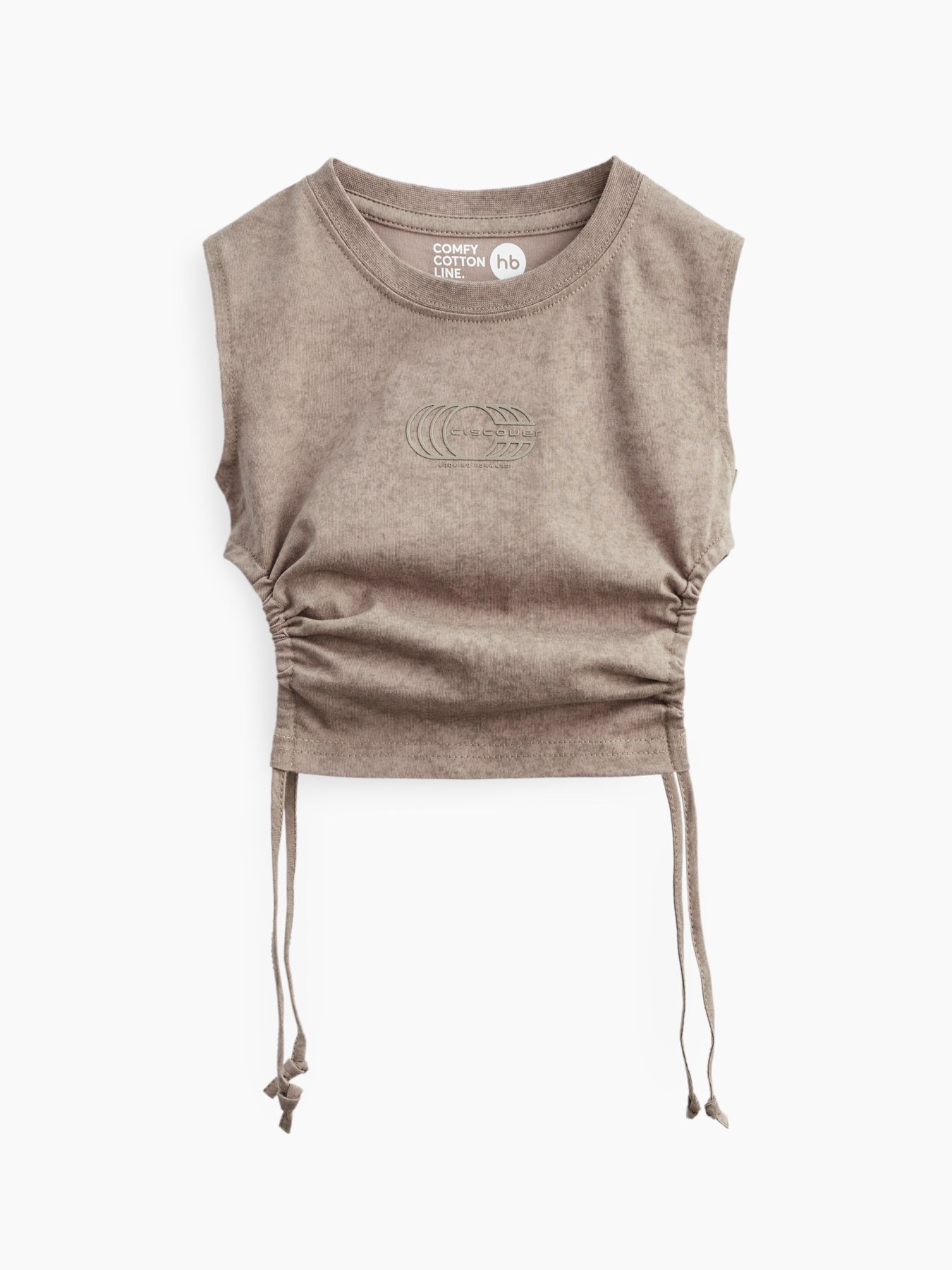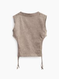 Удобный топ можно стилизовать разными способами. Шнурки по бокам позволяют изменять длину топа. Изделие сшито из ткани, в составе которой 100% хлопок. Материал дышит, хорошо тянется. Проймы удобные, не натирают и не мешают. Горловина дополнительно укреплена тесьмой.