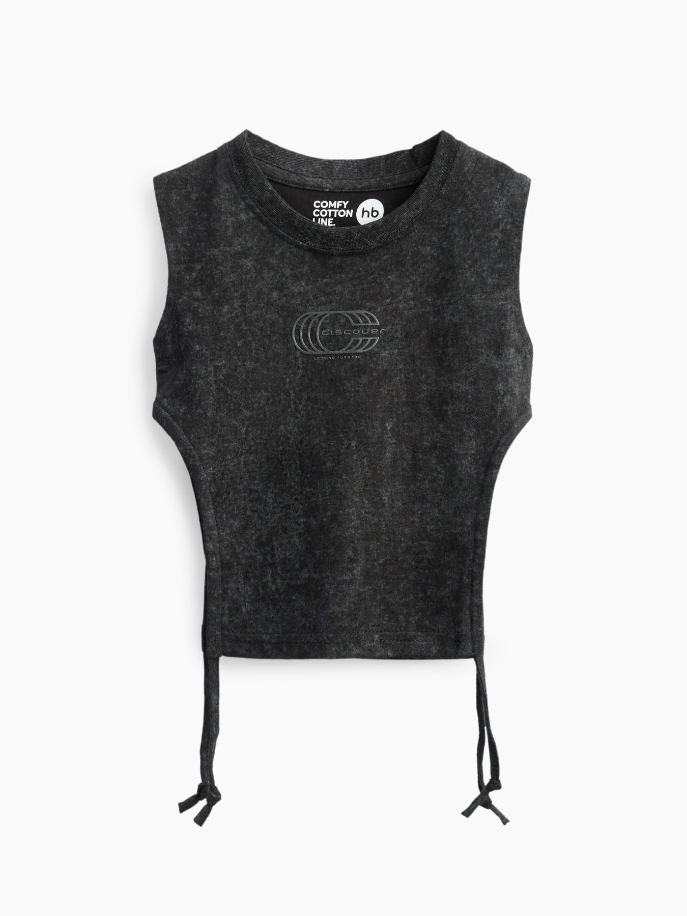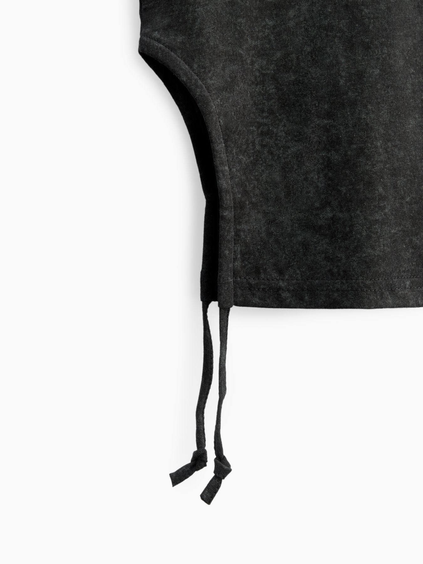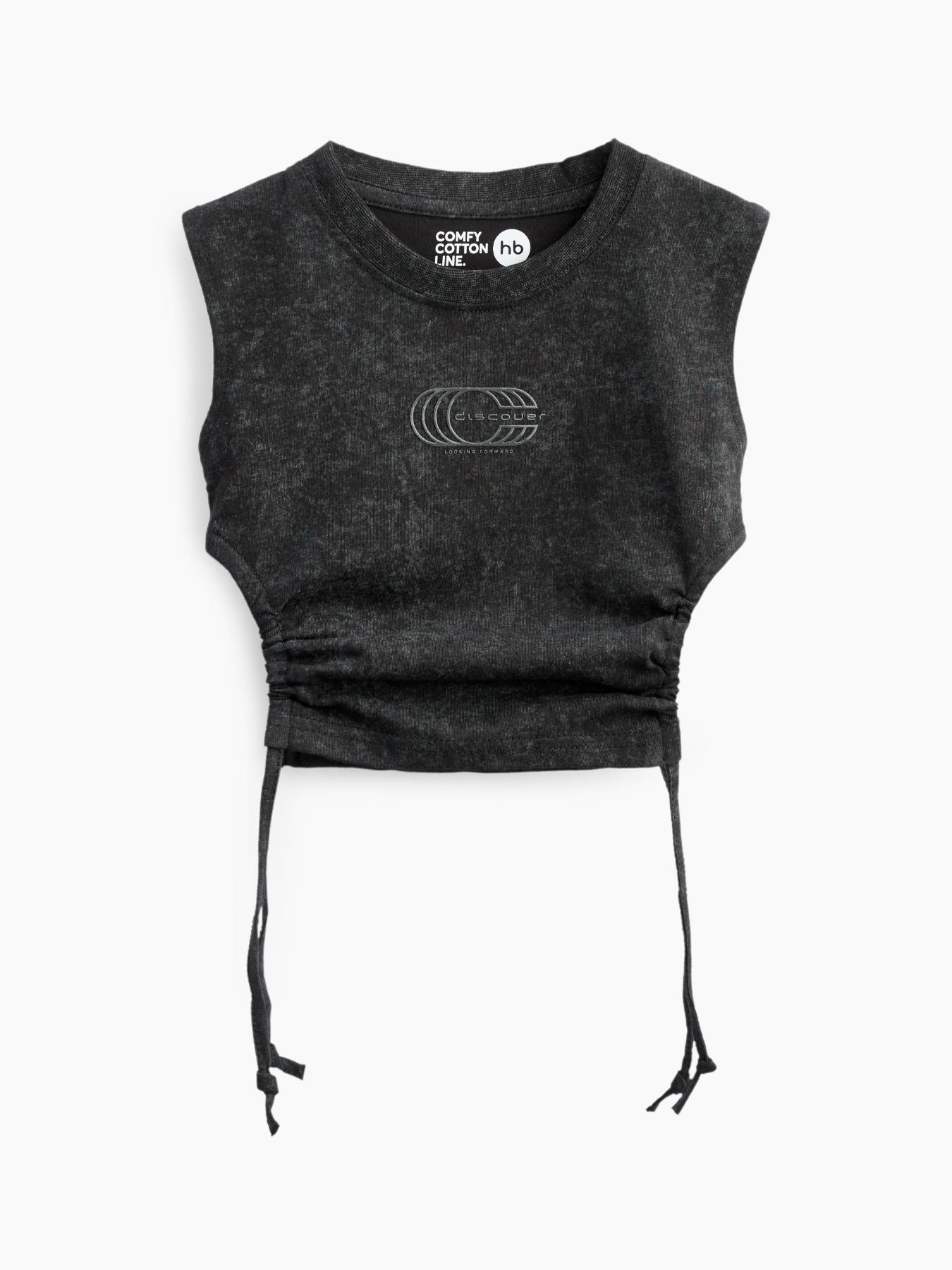 Удобный топ можно стилизовать разными способами. Шнурки по бокам позволяют изменять длину топа. Изделие сшито из ткани, в составе которой 100% хлопок. Материал дышит, хорошо тянется. Проймы удобные, не натирают и не мешают. Горловина дополнительно укреплена тесьмой.
